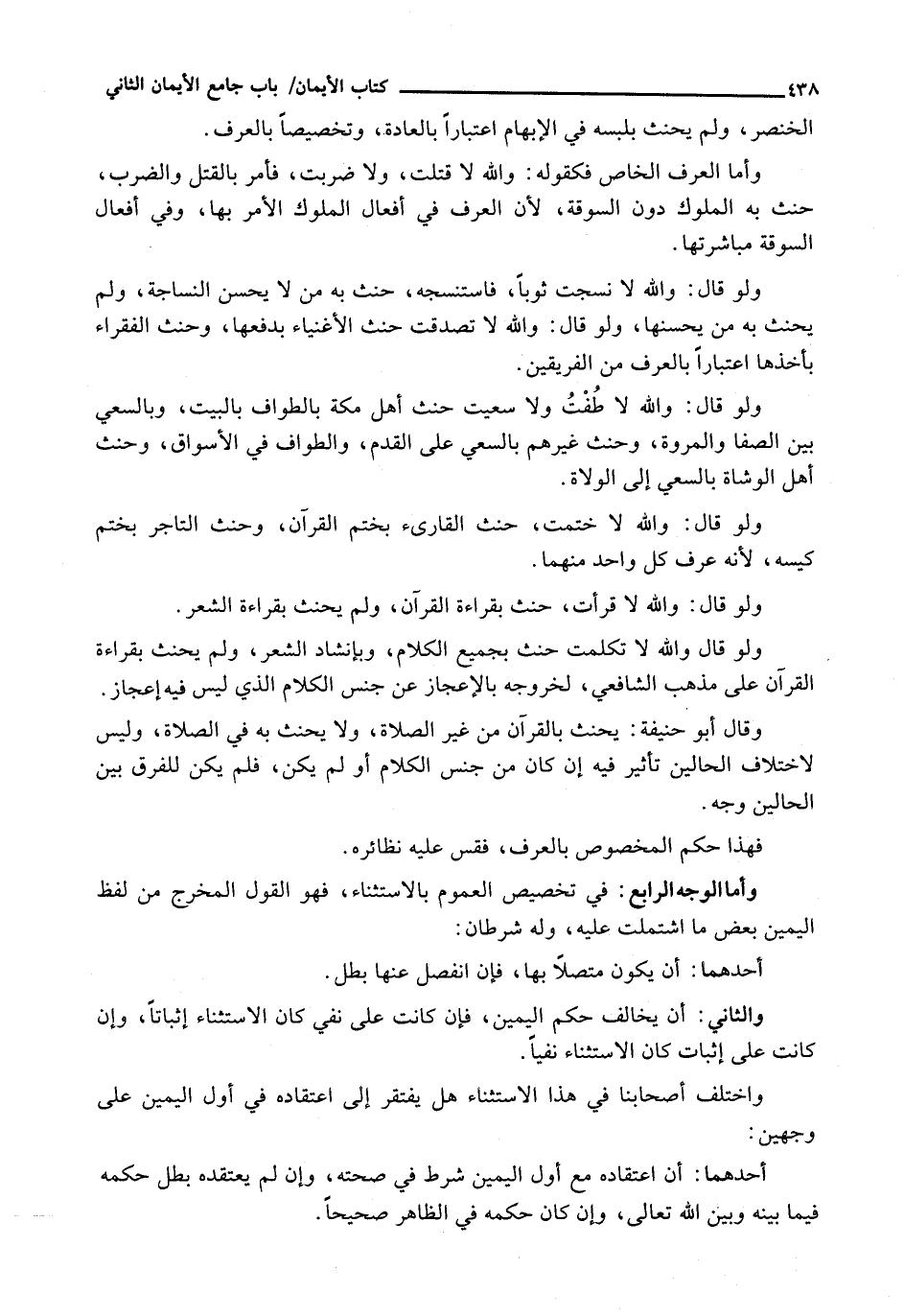 وَأَمَّا الْوَجْهُ الرَّابِعُ: فِي تَخْصِيصِ الْعُمُومِ بِالِاسْتِثْنَاءِ، فَهُوَ الْقَوْلُ الْمُخْرِجُ مِنْ لَفْظِ الْيَمِينِ بَعْضَ مَا اشْتَمَلَتْ عَلَيْهِ، وَلَهُ شَرْطَانِ: