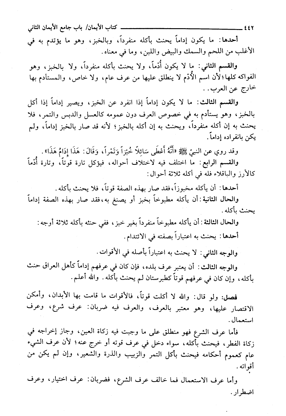 أَحَدُهَا: مَا يَكُونُ إِدَامًا يَحْنَثُ بِأَكْلِهِ مُنْفَرِدًا، وَبِالْخُبْزِ، وَهُوَ مَا يُؤْتَدَمُ بِهِ فِي الْأَغْلَبِ مِنَ اللَّحْمِ وَالسَّمَكِ وَالْبَيْضِ وَاللَّبَنِ، وَمَا فِي مَعْنَاهُ.
