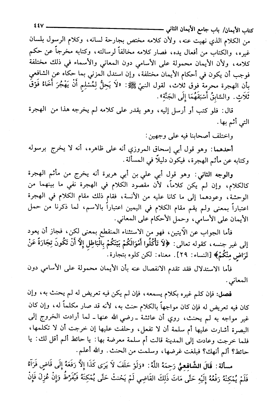 مِنَ الْكَلَامِ الَّذِي نُهِيَتْ عَنْهُ، وَلِأَنَّ كَلَامَهُ مُخْتَصٌّ بِجَارِحَةِ لِسَانِهِ، وَكَلَامِ الرَّسُولِ بِلِسَانِ غَيْرِهِ، وَالْكِتَابِ مِنْ أَفْعَالِ يَدِهِ، فَصَارَ كَلَامُهُ مُخَالِفًا لِرِسَالَتِهِ، وَكِتَابُهُ مُخْرِجًا عَنْ حُكْمِ كَلَامِهِ، وَلِأَنَّ الْأَيْمَانَ مَحْمُولَةٌ عَلَى الْأَسَامِي دُونَ الْمَعَانِي وَالْأَسْمَاءُ في ذلك مختلفة فوجب أن يكون فِي أَحْكَامِ الْأَيْمَانِ مُخْتَلِفَةً، وَإِنِ اسْتَدَلَّ الْمُزَنِيُّ بِمَا حَكَاهُ عَنِ الشَّافِعِيِّ بِأَنَّ الْهِجْرَةَ مُحَرَّمَةٌ فَوْقَ ثَلَاثٍ، لِقَوْلِ النَّبِيِّ - صَلَّى اللَّهُ عَلَيْهِ وَسَلَّم َ -: " لَا يَحِلُّ لِمُسْلِمٍ أَنْ يَهْجُرَ أَخَاهُ فَوْقَ ثلاثٍ. وَالسَّابِقُ أَسْبَقُهُمَا إِلَى الْجَنَّةِ ".