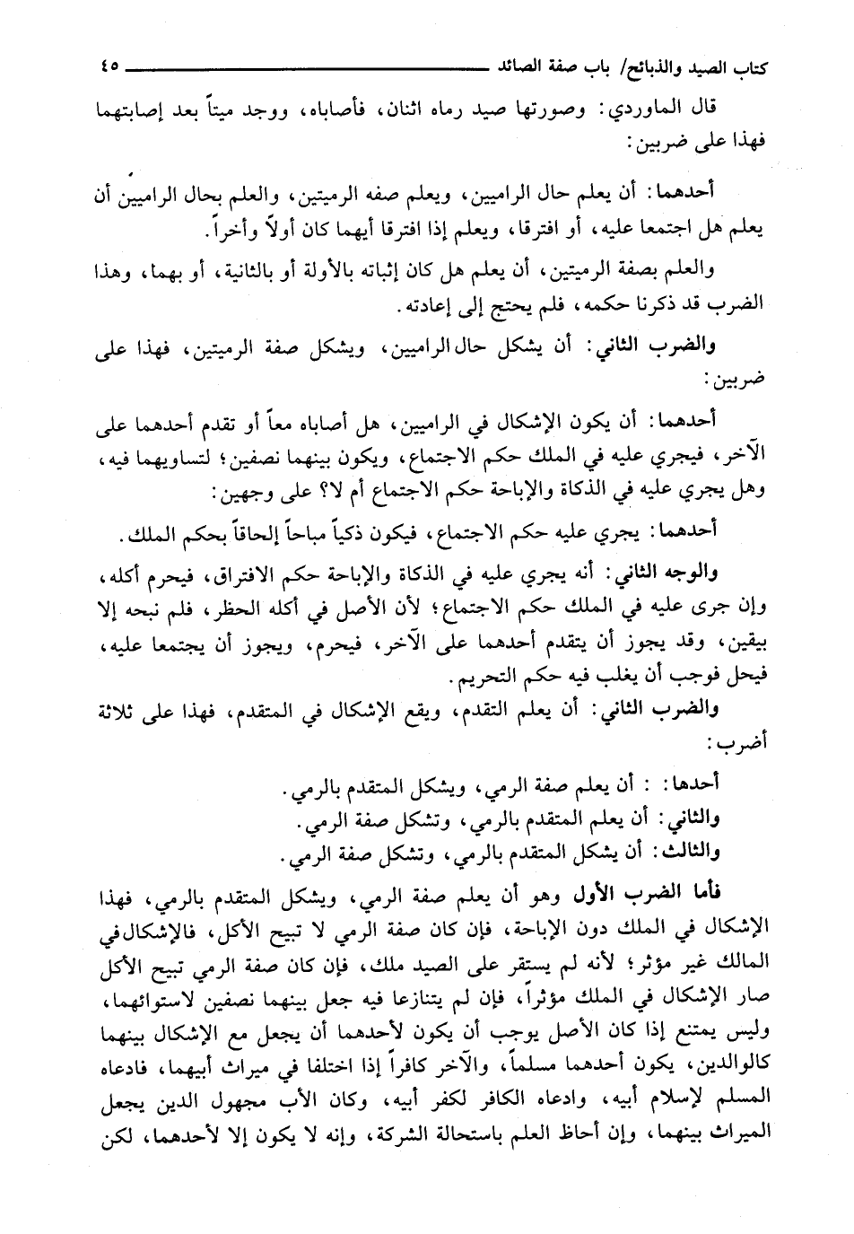 فَأَمَّا الضَّرْبُ الْأَوَّلُ وَهُوَ أَنْ يُعْلَمَ صِفَةُ الرَّمْيِ، وَيُشْكَلَ الْمُتَقَدِّمُ بِالرَّمْيِ، فَهَذَا الْإِشْكَالُ فِي الْمِلْكِ دُونَ الْإِبَاحَةِ، فَإِنْ كَانَ صِفَةُ الرَّمْيِ لَا تُبِيحُ الْأَكْلَ، فَالْإِشْكَالُ فِي الْمَالِكِ غَيْرُ مُؤَثِّرٍ؛ لِأَنَّهُ لَمْ يَسْتَقِرَّ عَلَى الصَّيْدِ مِلْكٌ، فَإِنْ كَانَ صِفَةُ الرَّمْيِ تُبِيحُ الْأَكْلَ صَارَ الْإِشْكَالُ فِي الْمِلْكِ مُؤَثِّرًا، فَإِنْ لَمْ يَتَنَازَعَا فِيهِ جُعِلَ بَيْنَهُمَا نِصْفَيْنِ لِاسْتِوَائِهِمَا، وَلَيْسَ يَمْتَنِعُ إِذَا كَانَ الْأَصْلُ يُوجِبُ أَنْ يَكُونَ لِأَحَدِهِمَا أَنْ يَجْعَلَ مَعَ الْإِشْكَالِ بَيْنَهُمَا كَالْوَالِدَيْنِ، يَكُونُ أَحَدُهُمَا مُسْلِمًا، وَالْآخَرُ كَافِرًا إِذَا اخْتَلَفَا فِي مِيرَاثِ أَبِيهِمَا، فَادَّعَاهُ الْمُسْلِمُ لِإِسْلَامِ أَبِيهِ، وَادَّعَاهُ الْكَافِرُ لِكُفْرِ أَبِيهِ، وَكَانَ الْأَبُ مَجْهُولَ الدِّينِ يُجْعَلُ الْمِيرَاثُ بَيْنَهُمَا، وَإِنْ أحاظ الْعِلْمُ بِاسْتِحَالَةِ الشَّرِكَةِ، وَأَنَّهُ لَا يَكُونُ إِلَّا لأحدهما، لكن