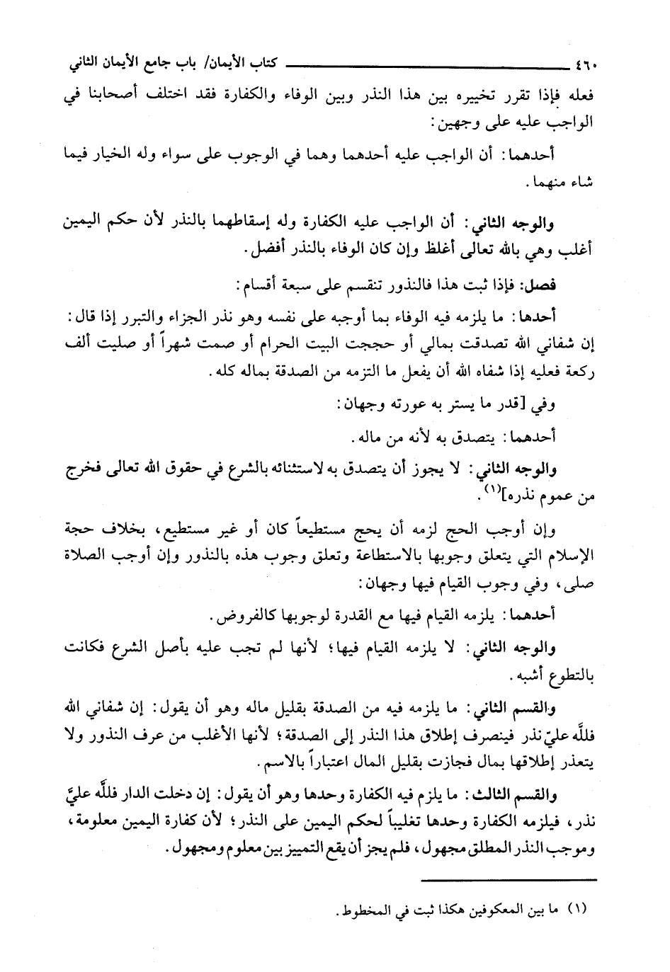 أَحَدُهَا: مَا يَلْزَمُهُ فِيهِ الْوَفَاءُ بِمَا أَوْجَبَهُ عَلَى نَفْسِهِ وَهُوَ نَذْرُ الْجَزَاءِ وَالتَّبَرُّرِ إِذَا قَالَ: إِنْ شَفَانِي اللَّهُ تَصَدَّقْتُ بِمَالِي أَوْ حَجَجْتُ الْبَيْتَ الْحَرَامَ أَوْ صُمْتُ شَهْرًا أَوْ صَلَّيْتُ أَلْفَ رَكْعَةٍ فَعَلَيْهِ إِذَا شَفَاهُ اللَّهُ أَنْ يَفْعَلَ مَا الْتَزَمَهُ مِنَ الصَّدَقَةِ بِمَالِهِ كُلِّهِ.