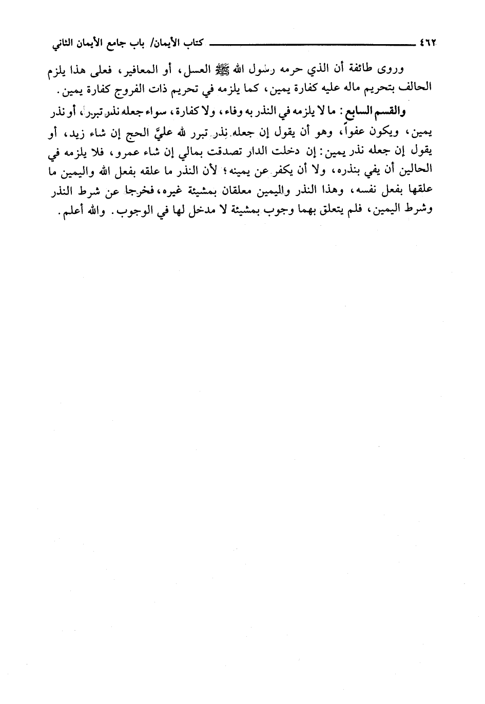 وَالْقِسْمُ السَّابِعُ: مَا لَا يَلْزَمُهُ فِي النَّذْرِ بِهِ وَفَاءٌ، وَلَا كَفَّارَةٌ، سَوَاءٌ جَعَلَهُ نَذْرَ تَبَرُّرٍ، أَوْ نَذْرَ يَمِينٍ، وَيَكُونُ عَفْوًا، وَهُوَ أَنْ يَقُولَ إِنْ جَعَلَهُ نَذْرَ تَبَرُّرٍ لِلَّهِ عَلَيَّ الْحَجُّ إِنْ شَاءَ زَيْدٌ، أَوْ يَقُولُ إِنْ جَعَلَهُ نَذْرَ يَمِينٍ: إِنْ دَخَلْتُ الدَّارَ تَصَدَّقْتُ بِمَالِي إِنْ شَاءَ عَمْرٌو، فَلَا يَلْزَمُهُ فِي الْحَالَيْنِ أَنْ يَفِيَ بِنَذْرِهِ، وَلَا أَنْ يُكَفِّرَ عَنْ يَمِينِهِ؛ لِأَنَّ النَّذْرَ مَا عَلَّقَهُ بِفِعْلِ اللَّهِ وَالْيَمِينَ مَا عَلَّقَهَا بِفِعْلِ نَفْسِهِ، وَهَذَا النَّذْرُ وَالْيَمِينُ مُعَلَّقَانِ بِمَشِيئَةِ غَيْرِهِ، فَخَرَجَا عَنْ شَرْطِ النَّذْرِ وَشَرْطِ الْيَمِينِ، فَلَمْ يَتَعَلَّقْ بِهِمَا وُجُوبٌ بِمَشِيئَةٍ لَا مَدْخَلَ لَهَا فِي الْوُجُوبِ. والله أعلم.