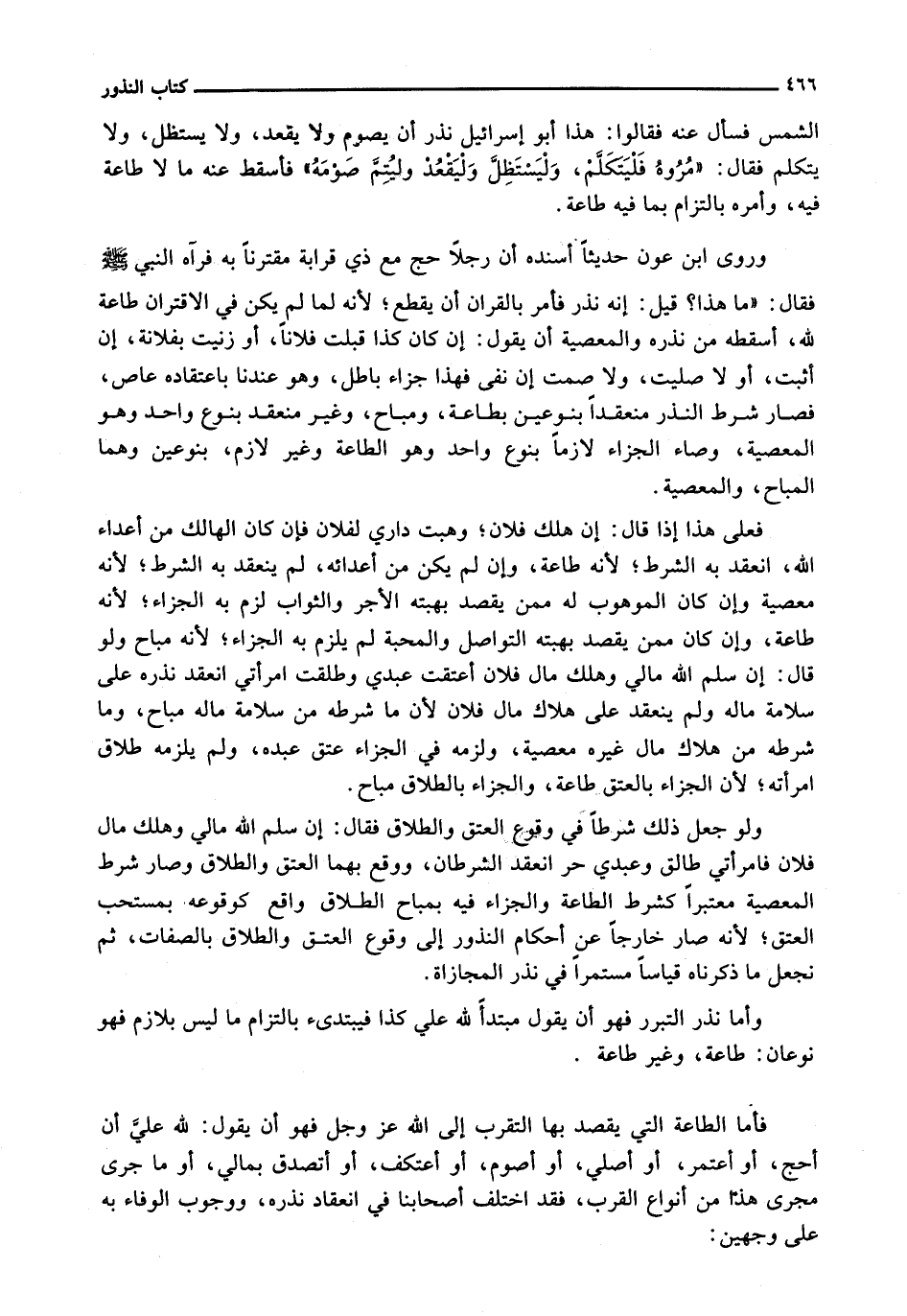 وَرَوَى ابْنُ عَوْنٍ حَدِيثًا أَسْنَدَهُ أَنَّ رَجُلًا حَجَّ مَعَ ذِي قَرَابَةٍ مُقْتَرِنًا بِهِ فَرَآهُ النَّبِيُّ - صَلَّى اللَّهُ عَلَيْهِ وَسَلَّم َ - فَقَالَ: " مَا هَذَا؟ قِيلَ: إِنَّهُ نَذَرَ فَأَمَرَ بِالْقِرَانِ أَنْ يُقْطَعَ؛ لِأَنَّهُ لَمَّا لَمْ يَكُنْ فِي الِاقْتِرَانِ طَاعَةٌ لِلَّهِ، أَسْقَطَهُ مِنْ نَذْرِهِ وَالْمَعْصِيَةُ أَنْ يَقُولَ: إِنْ كَانَ كَذَا قَبَّلْتُ فُلَانًا، أَوْ زَنَيْتُ بِفُلَانَةٍ، إِنْ أَثْبَتَ، أَوْ لَا صَلَّيْتُ، وَلَا صُمْتُ إِنْ نَفَى فَهَذَا جَزَاءٌ بَاطِلٌ، وَهُوَ عِنْدَنَا بِاعْتِقَادِهِ عَاصٍ، فَصَارَ شَرْطُ النَّذْرِ مُنْعَقِدًا بِنَوْعَيْنِ بِطَاعَةٍ، وَمُبَاحٍ، وَغَيْرَ منعقد بنوع واحد وهم الْمَعْصِيَةُ، وَصَارَ الْجَزَاءُ لَازِمًا بِنَوْعٍ وَاحِدٍ وَهُوَ الطَّاعَةُ وَغَيْرُ لَازِمٍ، بِنَوْعَيْنِ وَهُمَا الْمُبَاحُ، وَالْمَعْصِيَةُ.