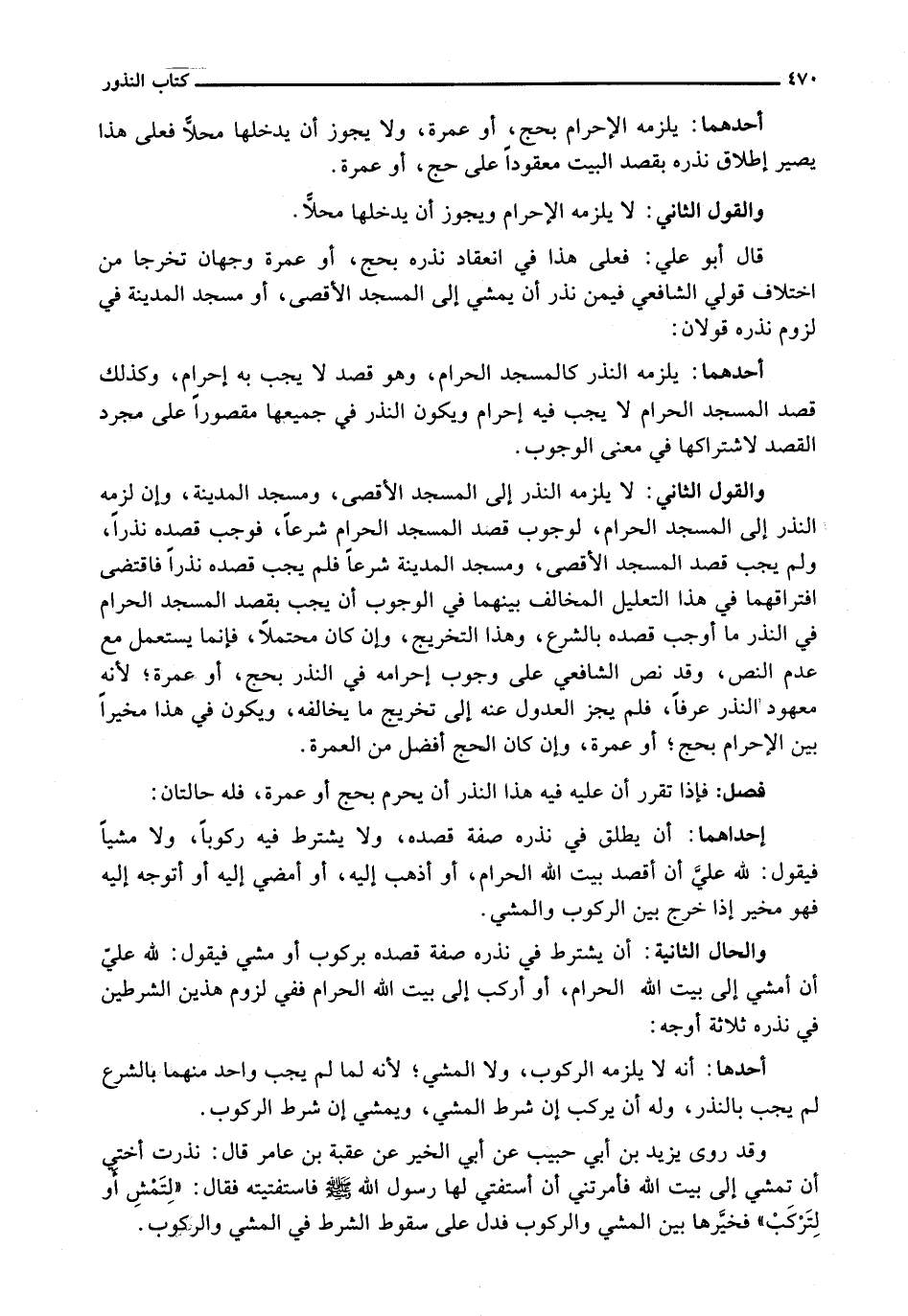 أَحَدُهُمَا: يَلْزَمُهُ النَّذْرُ كَالْمَسْجِدِ الْحَرَامِ، وَهُوَ قَصْدٌ لَا يَجِبُ بِهِ إِحْرَامٌ، وَكَذَلِكَ قَصْدُ الْمَسْجِدِ الْحَرَامِ لَا يَجِبُ فِيهِ إِحْرَامٌ وَيَكُونُ النَّذْرُ فِي جَمِيعِهَا مَقْصُورًا عَلَى مُجَرَّدِ الْقَصْدِ لِاشْتِرَاكِهَا فِي مَعْنَى الْوُجُوبِ.