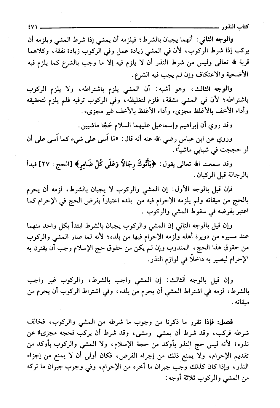 وَالْوَجْهُ الثَّالِثُ: وَهُوَ أَشْبَهُ: أَنَّ الْمَشْيَ يَلْزَمُ بِاشْتِرَاطِهِ، وَلَا يَلْزَمُ الرُّكُوبُ بِاشْتِرَاطِهِ؛ لِأَنَّ فِي الْمَشْيِ مَشَقَّةً، فَلَزِمَ لِتَغْلِيظِهِ، وَفِي الرُّكُوبِ تَرْفِيهٌ فَلَمْ يَلْزَمْ لِتَحْقِيقِهِ وَأَدَاءُ الْأَخَفِّ بِالْأَغْلَظِ مُجْزِئٌ وَأَدَاءُ الْأَغْلَظِ بِالْأَخَفِّ غَيْرُ مُجْزِئٍ.