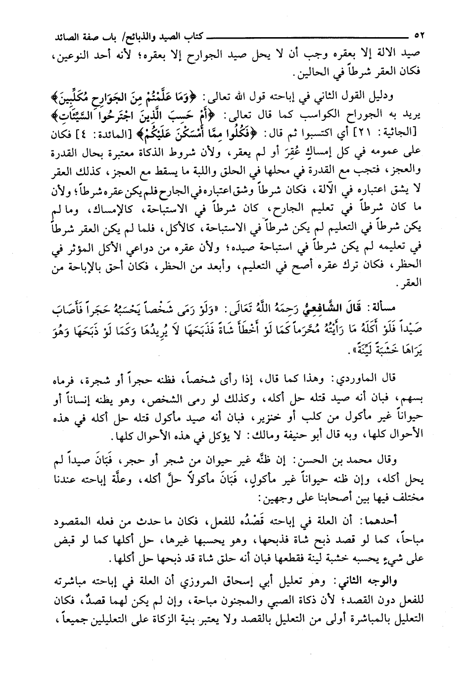 قَالَ الْمَاوَرْدِيُّ: وَهَذَا كَمَا قَالَ: إِذَا رَأَى شَخْصًا، فَظَنَّهُ حَجَرًا أَوْ شَجَرَةً، فَرَمَاهُ بِسَهْمٍ، فَبَانَ أَنَّهُ صَيْدٌ قَتَلَهُ حَلَّ أَكْلُهُ، وَكَذَلِكَ لَوْ رَمَى الشَّخْصَ، وَهُوَ يَظُنُّهُ إِنْسَانًا أَوْ حَيَوَانًا غَيْرَ مَأْكُولٍ مِنْ كَلْبٍ أَوْ خِنْزِيرٍ، فَبَانَ أَنَّهُ صَيْدٌ مَأْكُولٌ قَتَلَهُ حَلَّ أَكْلُهُ فِي هَذِهِ الْأَحْوَالِ كُلِّهَا، وَبِهِ قَالَ أَبُو حَنِيفَةَ وَمَالِكٌ: لا يُؤْكَلُ فِي هَذِهِ الْأَحْوَالِ كُلِّهَا.