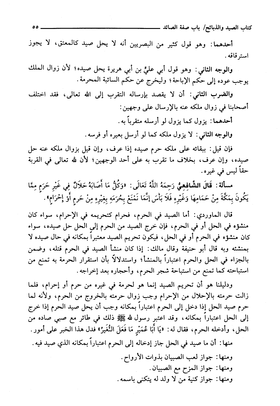 وَدَلِيلُنَا هُوَ أَنَّ تَحْرِيمَ الصَّيْدِ إِنَّمَا هُوَ لِحُرْمَةٍ فِي غَيْرِهِ مِنْ حَرَمٍ أَوْ إِحْرَامٍ، فَلَمَّا زَالَتْ حُرْمَتُهُ بِالْإِحْلَالِ مِنَ الْإِحْرَامِ وَجَبَ زَوَالُ حُرْمَتِهِ بِالْخُرُوجِ مِنَ الْحَرَمِ، وَلِأَنَّهُ لَمَّا حَرُمَ صَيْدُ الْحِلِّ إِذَا دَخَلَ إِلَى الْحَرَمِ اعْتِبَارًا بِمَكَانِهِ وَجَبَ أَنْ يَحِلَّ صَيْدُ الْحَرَمِ إِذَا خَرَجَ إِلَى الْحِلِّ اعْتِبَارًا بِمَكَانِهِ، وَقَدِ اعْتَبَرَ رَسُولُ اللَّهِ - صَلَّى اللَّهُ عَلَيْهِ وَسَلَّم َ - ذَلِكَ فِي طَائِرٍ مَعَ صَبِيٍّ صَادَهُ مِنَ الْحِلِّ، وَأَدْخَلَهُ الْحَرَمَ، فَقَالَ لَهُ: " يَا أَبَا عُمَيْرٍ مَا فَعَلَ النُّغَيْرُ " فَدَلَّ هَذَا الْخَبَرُ عَلَى أُمُورٍ.