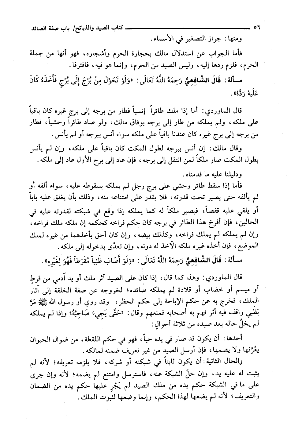 قَالَ الْمَاوَرْدِيُّ: وَهَذَا كَمَا قَالَ: إِذَا كَانَ عَلَى الصَّيْدِ أَثَرُ مِلْكٍ أَوْ يَدِ آدَمِيٍّ مِنْ قرطٍ أَوْ مَيْسِمٍ أَوْ خِضَابٍ أَوْ قِلَادَةٍ لَمْ يَمْلِكْهُ صَائِدُهُ؛ لِخُرُوجِهِ عَنْ صِفَةِ الْخِلْقَةِ إِلَى آثَارِ الْمِلْكِ، فَخَرَجَ بِهِ عَنْ حُكْمِ الإباحة إلى حكم الحظر، وقد روي أو رسول الله - صَلَّى اللَّهُ عَلَيْهِ وَسَلَّم َ - مَرَّ بِظَبْيٍ وَاقِفٍ فِيهِ أَثَرٌ فَهَمَّ بِهِ أَصْحَابُهُ فَمَنَعَهُمْ وَقَالَ: " حَتَى يَجِيءَ صَاحِبُهُ " وَإِذَا لَمْ يَمْلِكُهُ لَمْ يَخْلُ حَالُهُ بَعْدَ صَيْدِهِ مِنْ ثَلَاثَةِ أحوالٍ: