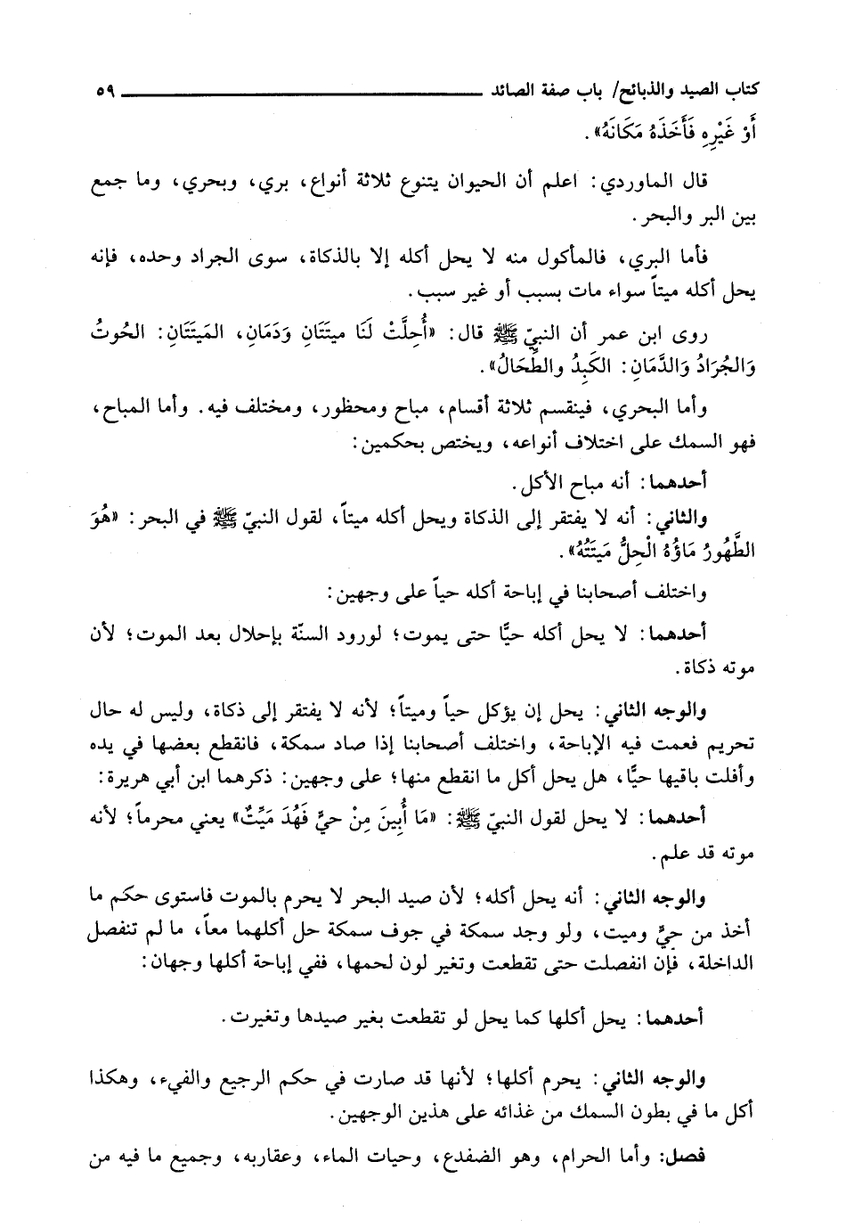 وَالْوَجْهُ الثَّانِي: يَحِلُّ أَنْ يُؤْكَلْ حَيًّا وَمَيْتًا؛ لِأَنَّهُ لَا يَفْتَقِرُ إِلَى ذَكَاةٍ، وَلَيْسَ لَهُ حَالُ تَحْرِيمٍ فَعَمَّتْ فِيهِ الْإِبَاحَةُ، وَاخْتَلَفَ أَصْحَابُنَا إِذَا صَادَ سَمَكَةً، فَانْقَطَعَ بَعْضُهَا فِي يَدِهِ وَأَفْلَتَ بَاقِيهَا حَيًّا، هَلْ يَحِلُّ أَكْلُ مَا انْقَطَعَ مِنْهَا؛ عَلَى وَجْهَيْنِ: ذَكَرَهُمَا ابْنُ أَبِي هُرَيْرَةَ: