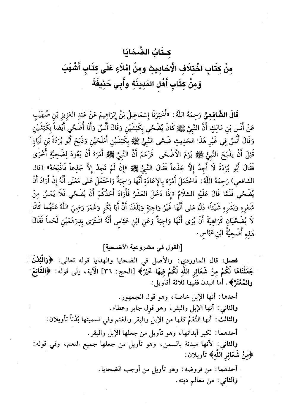 قَالَ الشَّافِعِيُّ رَحِمَهُ اللَّهُ: " أَخْبَرَنَا إِسْمَاعِيلَ بْنَ إِبْرَاهِيمَ عَنْ عَبْدِ الْعَزِيزِ بْنِ صُهَيْبٍ عَنْ أَنَسِ بْنِ مَالِكٍ أَنَّ النَّبِيَّ - صَلَّى اللَّهُ عَلَيْهِ وَسَلَّم َ - كَانَ يُضَحِّي بِكَبْشَيْنِ وَقَالَ أنسٌ وَأَنَا أُضَحِّي أيضاً بكبشين وقال أنسٌ في غير هذا الحديث ضحى النبي - صَلَّى اللَّهُ عَلَيْهِ وَسَلَّم َ - بكبشين أملحين وذبح أبو بردة بن نيارٍ قبل أن يذبح النبي - صَلَّى اللَّهُ عَلَيْهِ وَسَلَّم َ - يوم الأضحى فزعم أن النبي - صَلَّى اللَّهُ عَلَيْهِ وَسَلَّم َ - أمره أن يعود لضحيةٍ أخرى فقال أبو بردة لا أجد إلا جذعاً فقال النبي - صَلَّى اللَّهُ عَلَيْهِ وَسَلَّم َ - " إن لم تجد إلا جذعاً فاذبحه " (قال الشافعي) رحمه الله: فاحتمل أمره بالإعادة أنها واجبةٌ واحتمل على معنى أنه إن أراد أن يضحي فلما قال عليه السلام " إذا دخل العشر فأراد أَحَدُكُمْ أَنْ يُضَحِّيَ فَلَا يَمَسَّ مِنْ شَعْرِهِ وبشره شيئاً " دل على أنها غير واجبةٍ وبلغنا إِنَّ أَبَا بكرٍ وَعُمَرَ رَضِيَ اللَّهُ عَنْهُمَا كانا لا يضحيان كراهية أن يرى أنها واجبةٌ وعن ابن عباسٍ أنه اشترى بدرهمين لحماً فقال هذه أضحية ابن عباسٍ. القول في مشروعية الأضحية