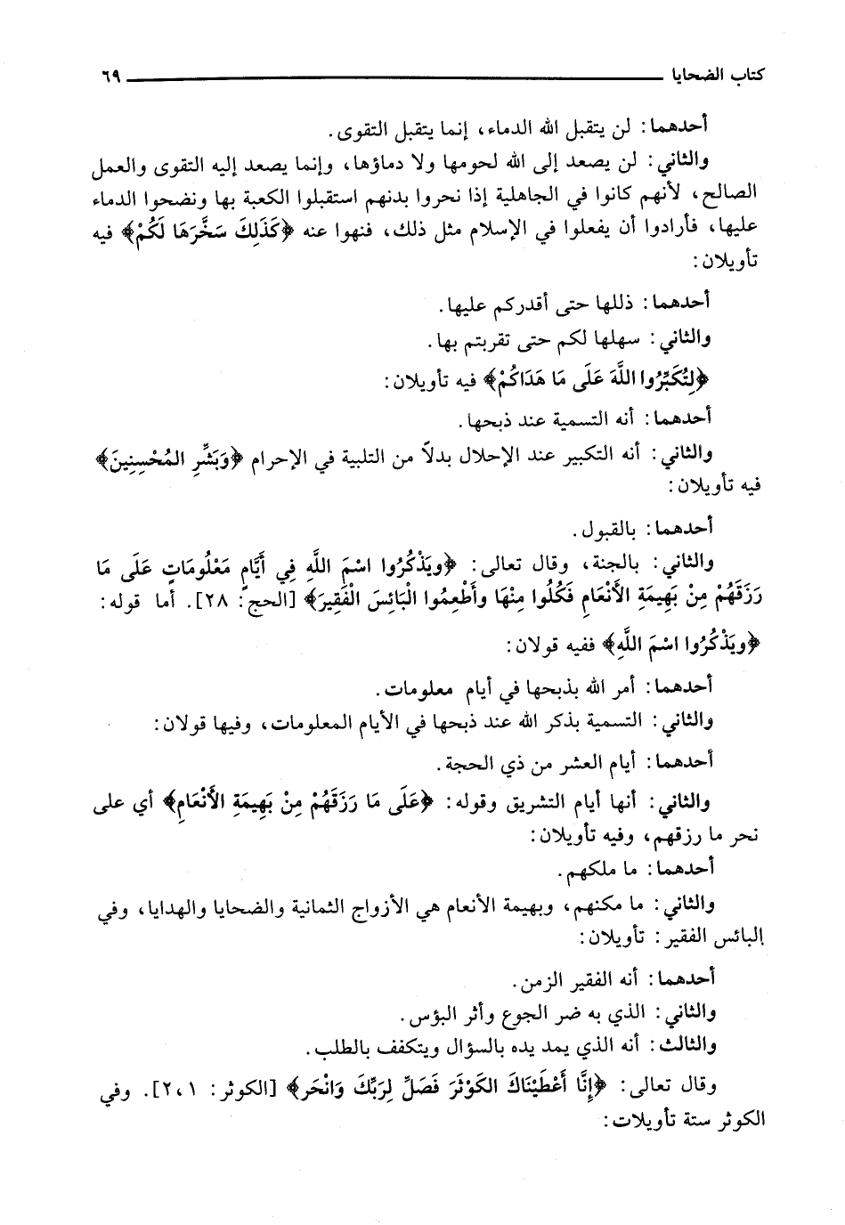 وَقَالَ تَعَالَى: {إِنَّا أَعْطَيْنَاكَ الكَوْثَرَ فَصَلِّ لِرَبِّكَ وَانْحَرْ) {الكوثر: 1 - 2) . وَفِي الْكَوْثَرِ ستة تأويلات: