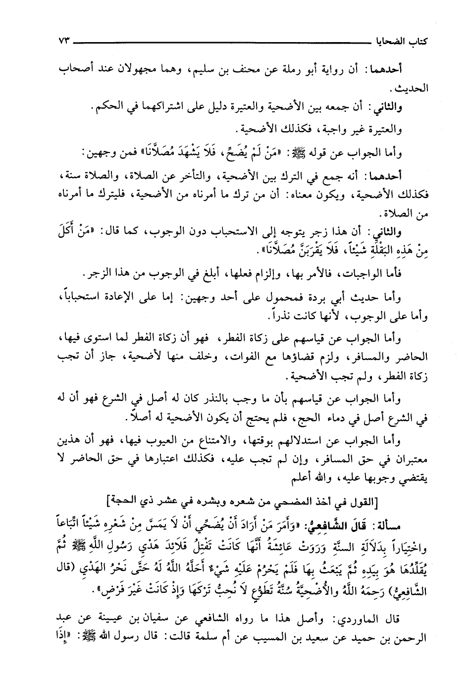 وَأَمَّا الْجَوَابُ عَنِ اسْتِدْلَالِهِمْ بِوَقْتِهَا، وَالِامْتِنَاعِ مِنَ الْعُيُوبِ فِيهَا، فَهُوَ إِنَّ هَذَيْنِ مُعْتَبَرَانِ فِي حَقِّ الْمُسَافِرِ، وَإِنْ لَمْ تَجِبْ عَلَيْهِ، فَكَذَلِكَ اعْتِبَارُهَا فِي حَقِّ الْحَاضِرِ لا يقتضي وجوبها عليه، والله أعلم. القول في أخذ المضحي من شعره وبشره في عشر ذي الحجة