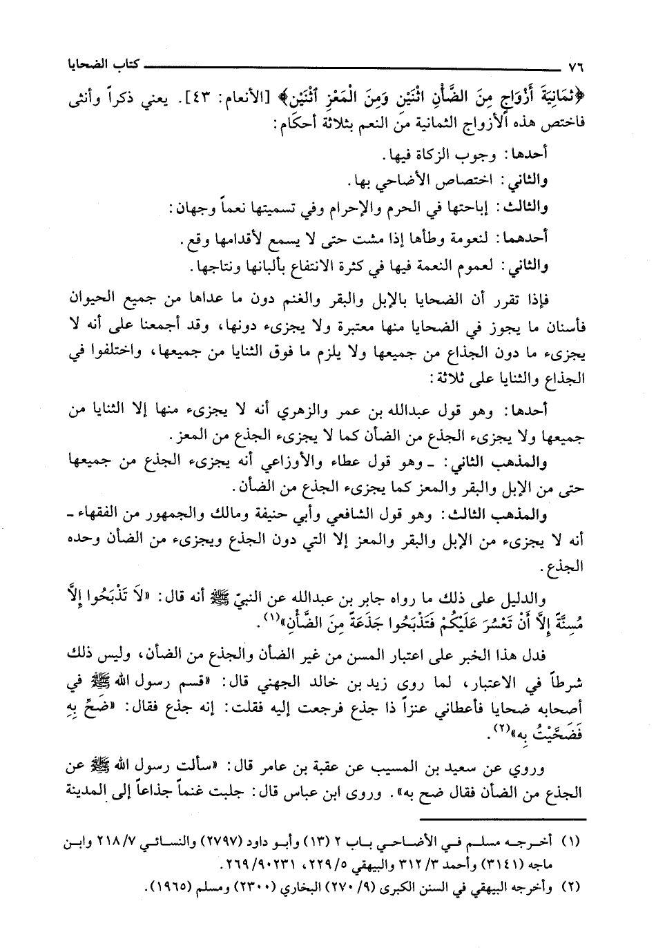 {ثَمَانِيَةَ أَزْوَاجٍ مِنَ الضَّأْنِ اثْنَيْنِ وِمَنَ الْمَعْزِ اثْنَيْنِ) {الأنعام: 43) . يَعْنِي ذَكَرًا وَأُنْثَى فَاخْتَصَّ هَذِهِ الْأَزْوَاجَ الثَّمَانِيَةَ مِنَ النَّعَمِ بِثَلَاثَةِ أَحْكَامٍ: