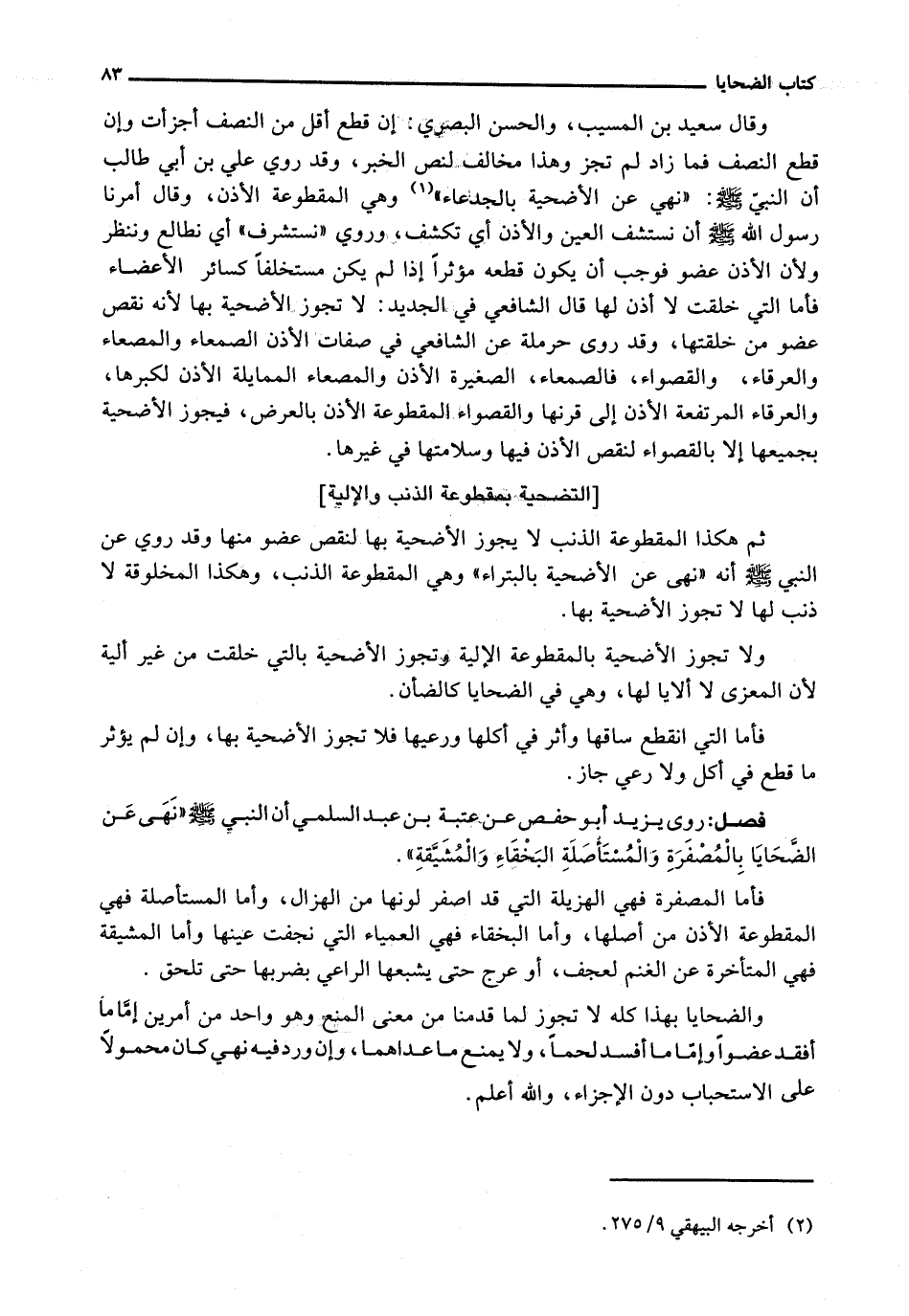 وَقَالَ سَعِيدُ بْنُ الْمُسَيَّبِ، وَالْحَسَنُ الْبَصْرِيُّ: إِنْ قَطَعَ أَقَلَّ مِنَ النِّصْفِ أَجْزَأَتْ وَإِنْ قَطَعَ النِّصْفَ فَمَا زَادَ لَمْ تُجْزِ وَهَذَا مُخَالِفٌ لِنَصِّ الْخَبَرِ، وَقَدْ رَوَى عَلِيِّ بْنِ أَبِي طَالِبٍ أَنَّ النَّبِيَّ - صَلَّى اللَّهُ عَلَيْهِ وَسَلَّم َ -: " نَهَى عَنِ الْأُضْحِيَّةِ بِالْجَدْعَاءِ " وَهِيَ الْمَقْطُوعَةُ الْأُذُنِ، وَقَالَ أَمَرَنَا رَسُولُ اللَّهِ - صَلَّى اللَّهُ عَلَيْهِ وَسَلَّم َ - أن نستشف العين والأذن أي تكشف، وَرُوِيَ " نَسْتَشْرِفَ " أَيْ نُطَالِعُ وَنَنْظُرُ وَلِأَنَّ الْأُذُنَ عُضْوٌ فَوَجَبَ أَنْ يَكُونَ قَطْعُهُ مُؤَثِّرًا إِذَا لَمْ يَكُنْ مُسْتَخْلَفًا كَسَائِرِ الْأَعْضَاءِ فَأَمَّا الَّتِي خُلِقَتْ لَا أُذُنَ لَهَا قَالَ الشَّافِعِيُّ فِي الْجَدِيدِ: لَا تَجُوزُ الْأُضْحِيَّةُ بِهَا لِأَنَّهُ نَقْصُ عُضْوٍ مِنْ خِلْقَتِهَا، وَقَدْ رَوَى حَرْمَلَةُ عَنِ الشَّافِعِيِّ فِي صِفَاتِ الْأُذُنِ الصَّمْعَاءِ وَالْمَصْعَاءِ وَالْعَرْقَاءِ، وَالْقَصْوَاءِ، فَالصَّمْعَاءُ، الصَّغِيرَةُ الْأُذُنِ وَالْمَصْعَاءُ الْمُمَايَلَةُ الْأُذُنِ لِكِبَرِهَا، وَالْعَرْقَاءُ الْمُرْتَفِعَةُ الْأُذُنِ إِلَى قَرْنِهَا وَالْقَصْوَاءُ الْمَقْطُوعَةُ الْأُذُنِ بِالْعَرْضِ، فَيَجُوزُ الْأُضْحِيَّةُ بِجَمِيعِهَا إِلَّا بِالْقَصْوَاءِ لِنَقْصِ الْأُذُنِ فِيهَا وَسَلَامَتِهَا فِي غَيْرِهَا. التضحية بمقطوعة الذنب والإلية