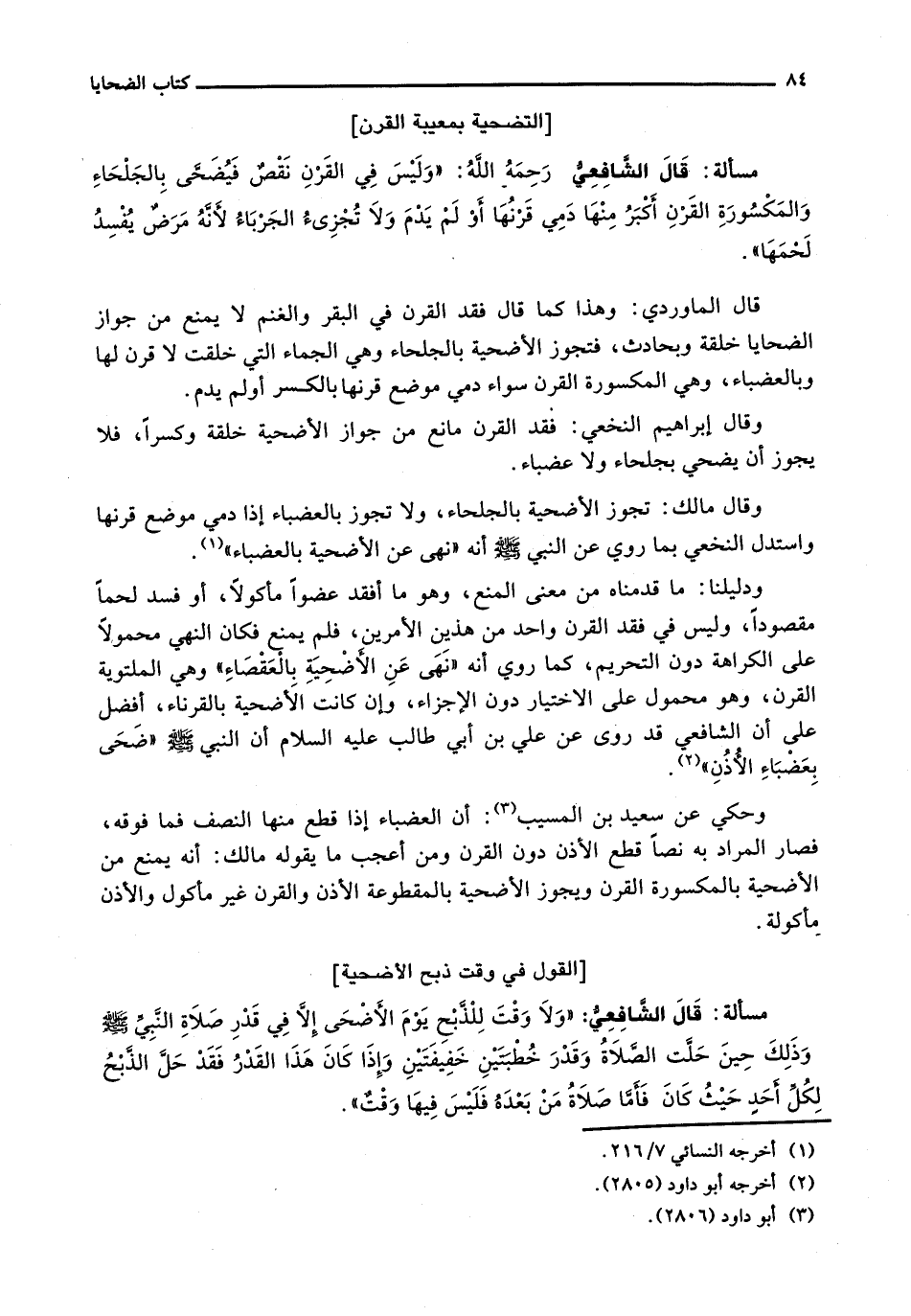 قال الشافعي: " وَلَا وَقْتَ لِلذَّبْحِ يَوْمَ الْأَضْحَى إِلَّا فِي قَدْرِ صَلَاةِ النَّبِيِّ - صَلَّى اللَّهُ عَلَيْهِ وَسَلَّم َ - وَذَلِكَ حِينَ حَلَّتِ الصَّلَاةُ وَقَدَّرَ خُطْبَتَيْنِ خَفِيفَتَيْنِ وَإِذَا كَانَ هَذَا الْقَدْرُ فَقَدْ حَلَّ الذَّبْحُ لِكُلِّ أحدٍ حَيْثُ كَانَ فَأَمَّا صَلَاةٌ مَنْ بَعْدَهُ فَلَيْسَ فِيهَا وقتٌ ".
