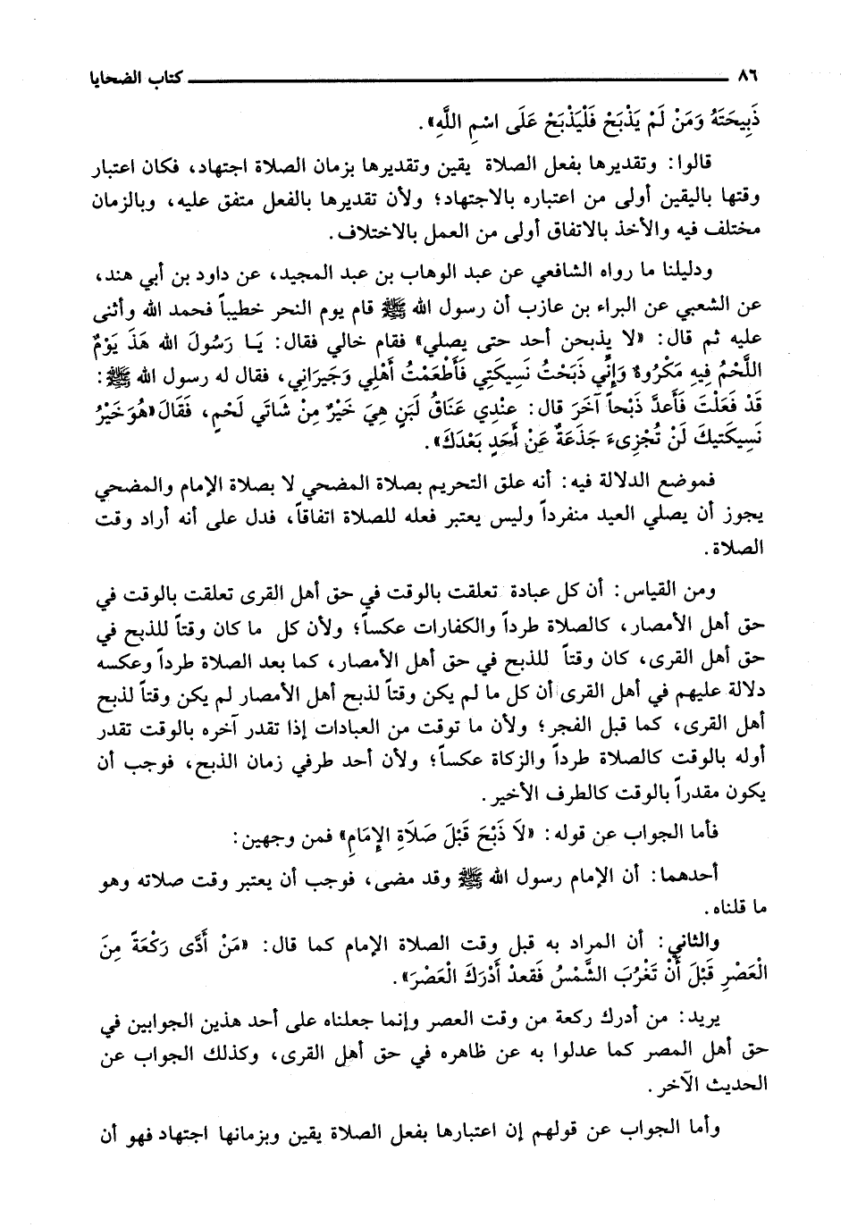 فَأَمَّا الْجَوَابُ عَنْ قَوْلِهِ: " لَا ذَبْحَ قَبْلَ صَلَاةِ الْإِمَامِ " فَمِنْ وَجْهَيْنِ:
