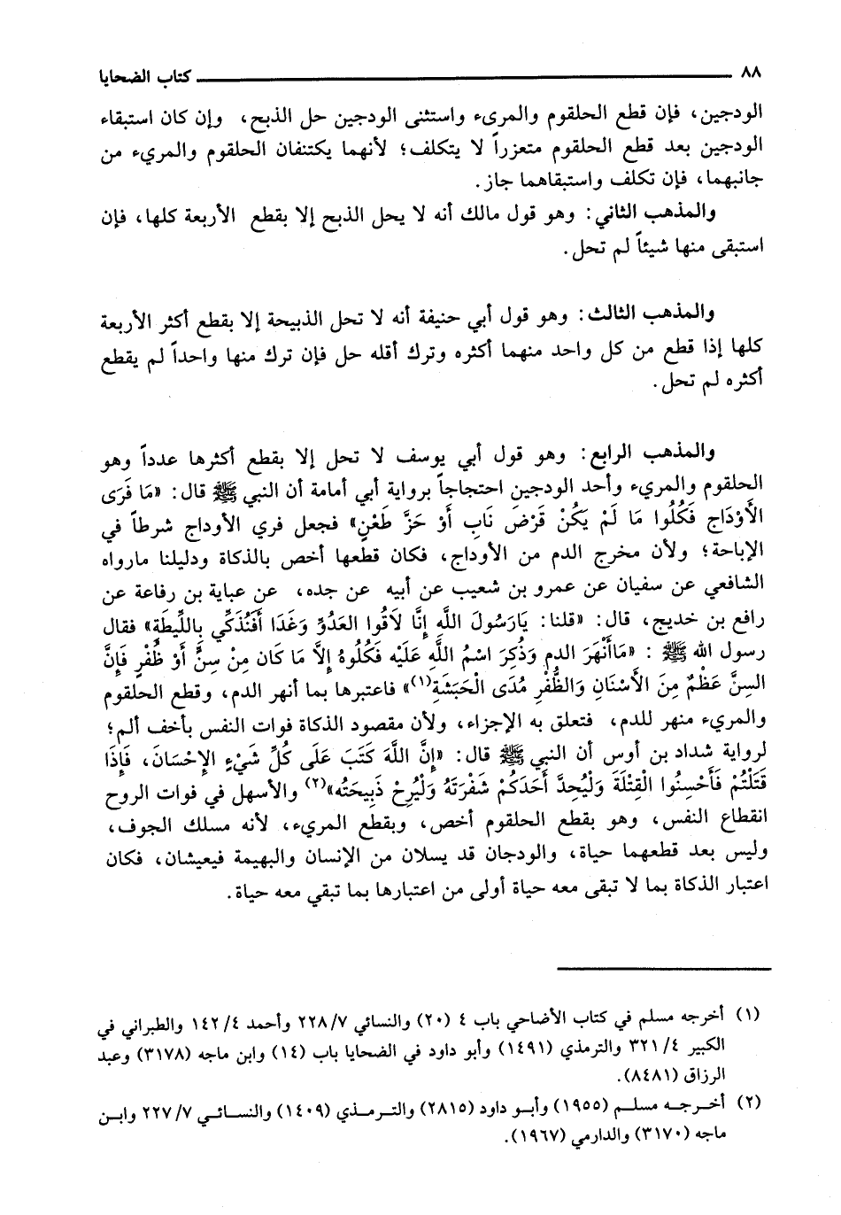 وَالْمَذْهَبُ الرَّابِعُ: وَهُوَ قَوْلُ أَبِي يُوسُفَ لَا تَحِلُّ إِلَّا بِقَطْعِ أَكْثَرِهَا عَدَدًا وَهُوَ الْحُلْقُومُ وَالْمَرِيءُ وَأَحَدُ الْوَدَجَيْنِ احْتِجَاجًا بِرِوَايَةِ أَبِي أُمَامَةَ أَنَّ النَّبِيَّ - صَلَّى اللَّهُ عَلَيْهِ وَسَلَّم َ - قَالَ: " مَا فَرَى الْأَوْدَاجَ فَكُلُوا مَا لَمْ يكن فرض نَابٍ أَوْ حَزَّ طَعْنٍ " فَجَعَلَ فَرْيَ الْأَوْدَاجِ شَرْطًا فِي الْإِبَاحَةِ؛ وَلِأَنَّ مَخْرَجَ الدَّمِ مِنَ الْأَوْدَاجِ، فَكَانَ قَطْعُهَا أَخَصَّ بِالذَّكَاةِ وَدَلِيلُنَا مَا رَوَاهُ الشَّافِعِيُّ عَنْ سُفْيَانَ عَنْ عَمْرِو بْنِ شُعَيْبٍ عَنْ أَبِيهِ عَنْ جَدِّهِ، عَنْ عَبَايَةَ بْنِ رَفَاعَةَ عَنْ رَافِعِ بْنِ خَدِيجٍ، قَالَ: " قلنا: يا رسول الله إنا لاقوا العدو وغداً أَفَنُذَكِّي بِاللِّيطَةِ " فَقَالَ رَسُولُ اللَّهِ - صَلَّى اللَّهُ عَلَيْهِ وَسَلَّم َ -: " مَا أَنْهَرَ الدَّمَ وَذُكِرَ اسْمُ اللَّهِ عَلَيْهِ فَكُلُوهُ إِلَّا مَا كَانَ مِنْ سِنٍّ أَوْ ظُفْرٍ فَإِنَّ السِّنَّ عظمٌ مِنَ الْأَسْنَانِ وَالظُّفْرَ مُدَى الْحَبَشَةِ " فَاعْتَبَرَهَا بِمَا أَنْهَرَ الدَّمَ، وَقَطَعَ الْحُلْقُومَ وَالْمَرِيءُ مَنْهَرٌ لِلدَّمِ، فَتَعَلَّقَ بِهِ الْإِجْزَاءُ، وَلِأَنَّ مَقْصُودَ الذَّكَاةِ فَوَاتُ النَّفْسِ بِأَخَفِّ أَلَمٍ؛ لِرِوَايَةِ شَدَّادِ بْنِ أَوْسٍ أَنَّ النَّبِيَّ - صَلَّى اللَّهُ عَلَيْهِ وَسَلَّم َ - قَالَ: " إِنَّ اللَّهَ كَتَبَ عَلَى كُلِّ شيءٍ الْإِحْسَانَ، فَإِذَا قَتَلْتُمْ فَأَحْسِنُوا الْقِتْلَةَ وَلِيُحِدَّ أَحَدُكُمْ شَفْرَتَهُ وَلْيُرِحْ ذَبِيحَتَهُ " وَالْأَسْهَلُ فِي فَوَاتِ الرُّوحِ انْقِطَاعُ النَّفَسِ، وَهُوَ بِقَطْعِ الْحُلْقُومِ أَخَصُّ، وَبِقِطَعِ الْمَرِيءِ، لِأَنَّهُ مَسْلَكُ الْجَوْفِ، وَلَيْسَ بَعْدَ قَطْعِهِمَا حَيَاةٌ، وَالْوَدَجَانِ قَدْ يُسَلَّانِ مِنَ الْإِنْسَانِ وَالْبَهِيمَةِ فَيَعِيشَانِ، فَكَانَ اعْتِبَارُ الذَّكَاةِ بِمَا لَا تَبْقَى مَعَهُ حَيَاةٌ أَوْلَى مِنِ اعْتِبَارِهَا بِمَا تَبْقَى معه حياة.