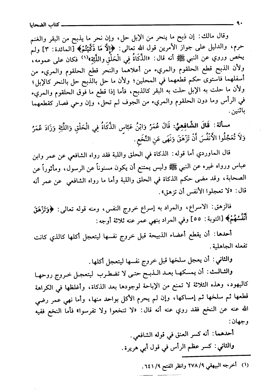قَالَ الْمَاوَرْدِيُّ أَمَّا قَوْلُهُ: الذَّكَاةُ فِي الْحَلْقِ وَاللَّبَّةِ فَقَدْ رَوَاهُ الشَّافِعِيُّ عَنْ عُمَرَ وَابْنِ عَبَّاسٍ وَرَوَاهُ غَيْرُهُ عن النبي - صَلَّى اللَّهُ عَلَيْهِ وَسَلَّم َ - وَلَيْسَ يَمْتَنِعُ أَنْ يَكُونَ مَسْنُونًا عَنِ الرَّسُولِ، وَمَأْثُورًا عَنِ الصَّحَابَةِ، وَقَدْ مَضَى حُكْمُ الذَّكَاةِ فِي الْحَلْقِ وَاللَّبَّةِ وَأَمَّا مَا رَوَاهُ الشَّافِعِيُّ عَنْ عُمَرَ أَنَّهُ قَالَ: " لَا تُعَجِّلُوا الْأَنْفُسَ أَنْ تَزْهَقَ ".