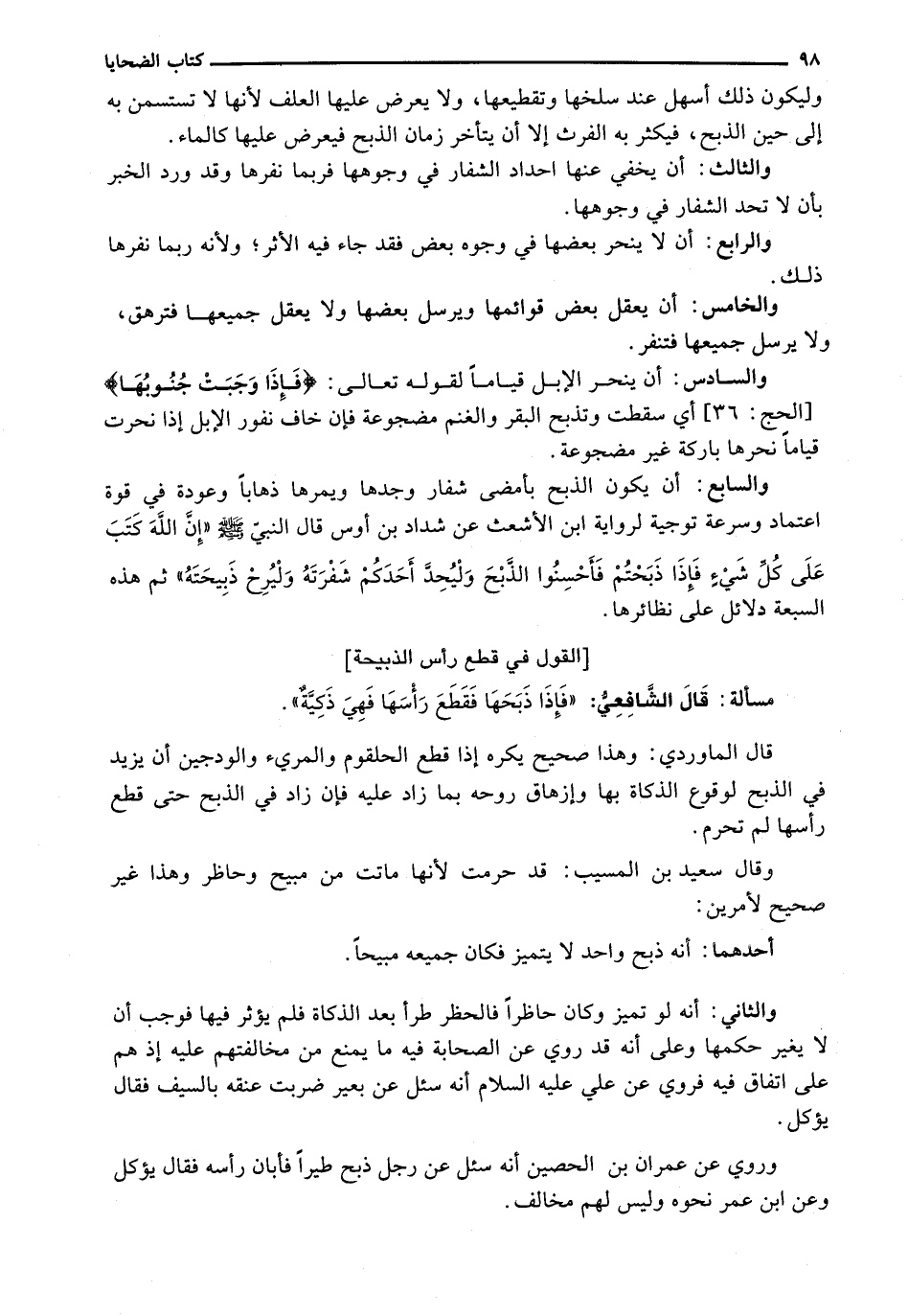 وَالسَّابِعُ: أَنْ يَكُونَ الذَّبْحُ بِأَمْضَى شِفَارٍ وَجَدَهَا وَيُمِرُّهَا ذَهَابًا وَعَوْدَةً فِي قُوَّةِ اعْتِمَادٍ وَسُرْعَةِ تَوْجِيَةٍ لِرِوَايَةِ ابْنِ الْأَشْعَثِ عَنْ شَدَّادِ بْنِ أَوْسٍ قَالَ النَّبِيُّ - صَلَّى اللَّهُ عَلَيْهِ وَسَلَّم َ - " إن الله كتب عَلَى كُلِّ شيءٍ فَإِذَا ذَبَحْتُمْ فَأَحْسِنُوا الذَّبْحَ وَلْيُحِدَّ أَحَدَكُمْ شَفْرَتَهُ وَلْيُرِحْ ذَبِيحَتَهُ " ثُمَّ هَذِهِ السَّبْعَةُ دَلَائِلُ عَلَى نَظَائِرِهَا. الْقَوْلُ فِي قَطْعِ رَأْسِ الذَّبِيحَةِ