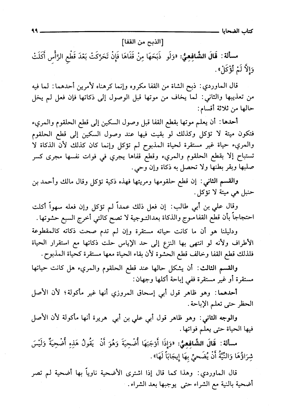 قَالَ الْمَاوَرْدِيُّ: ذَبُحُ الشَّاةِ مِنَ الْقَفَا مَكْرُوهٌ وَإِنَّمَا كَرِهْنَاهُ لِأَمْرَيْنِ أَحَدُهُمَا: لِمَا فِيهِ مِنْ تَعْذِيبِهَا وَالثَّانِي: لِمَا يُخَافُ مِنْ مَوْتِهَا قَبْلَ الْوُصُولِ إِلَى ذَكَاتِهَا فَإِنْ فَعَلَ لَمْ يَخْلُ حَالُهَا مِنْ ثَلَاثَةِ أَقْسَامٍ: