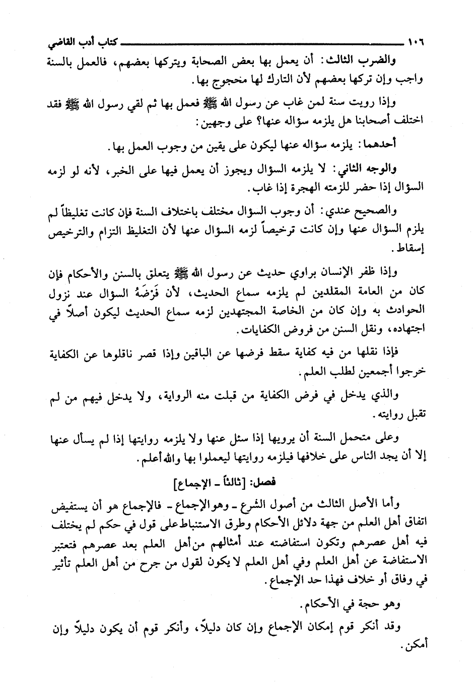 وَإِذَا ظَفِرَ الْإِنْسَانُ بِرَاوِي حَدِيثٍ عَنْ رَسُولِ اللَّهِ - صَلَّى اللَّهُ عَلَيْهِ وَسَلَّم َ - يَتَعَلَّقُ بِالسُّنَنِ وَالْأَحْكَامِ فَإِنْ كَانَ مِنَ الْعَامَّةِ الْمُقَلِّدِينَ لَمْ يَلْزَمْهُ سَمَاعُ الْحَدِيثِ، لِأَنَّ فَرْضَهُ السُّؤَالَ عِنْدَ نُزُولِ الْحَوَادِثِ بِهِ وَإِنْ كَانَ مِنَ الْخَاصَّةِ الْمُجْتَهِدِينَ لَزِمَهُ سَمَاعُ الْحَدِيثِ لِيَكُونَ أَصْلًا فِي اجْتِهَادِهِ، وَنَقْلُ السُّنَنِ مِنْ فُرُوضِ الْكِفَايَاتِ.