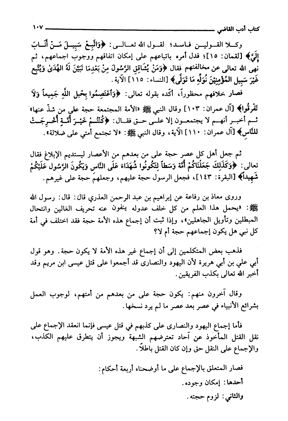 فَصَارَ خِلَافُهُمْ مَحْظُورًا، أَكَّدَهُ بِقَوْلِهِ تَعَالَى: {وَاعْتَصِمُوا بِحَبْلِ اللَّهِ جَمِيعًا وَلا تَفَرَّقُوا} [آل عمران: 103] وَقَالَ النَّبِيُّ - صَلَّى اللَّهُ عَلَيْهِ وَسَلَّم َ - " الْأُمَّةُ الْمُجْتَمِعَةُ حُجَّةٌ عَلَى مَنْ شَذَّ عَنْهَا " ثُمَّ أَخْبَرَ أَنَّهُمْ لَا يَجْتَمِعُونَ إِلَّا عَلَى حَقٍّ فَقَالَ: {كُنْتُمْ خَيْرَ أُمَّةٍ أُخْرِجَتْ لِلنَّاسِ} [آل عمران: 110] الْآيَةَ، وَقَالَ النَّبِيُّ - صَلَّى اللَّهُ عَلَيْهِ وَسَلَّم َ -: " لَا تَجْتَمِعُ أُمَّتِي عَلَى ضَلَالَةٍ ".