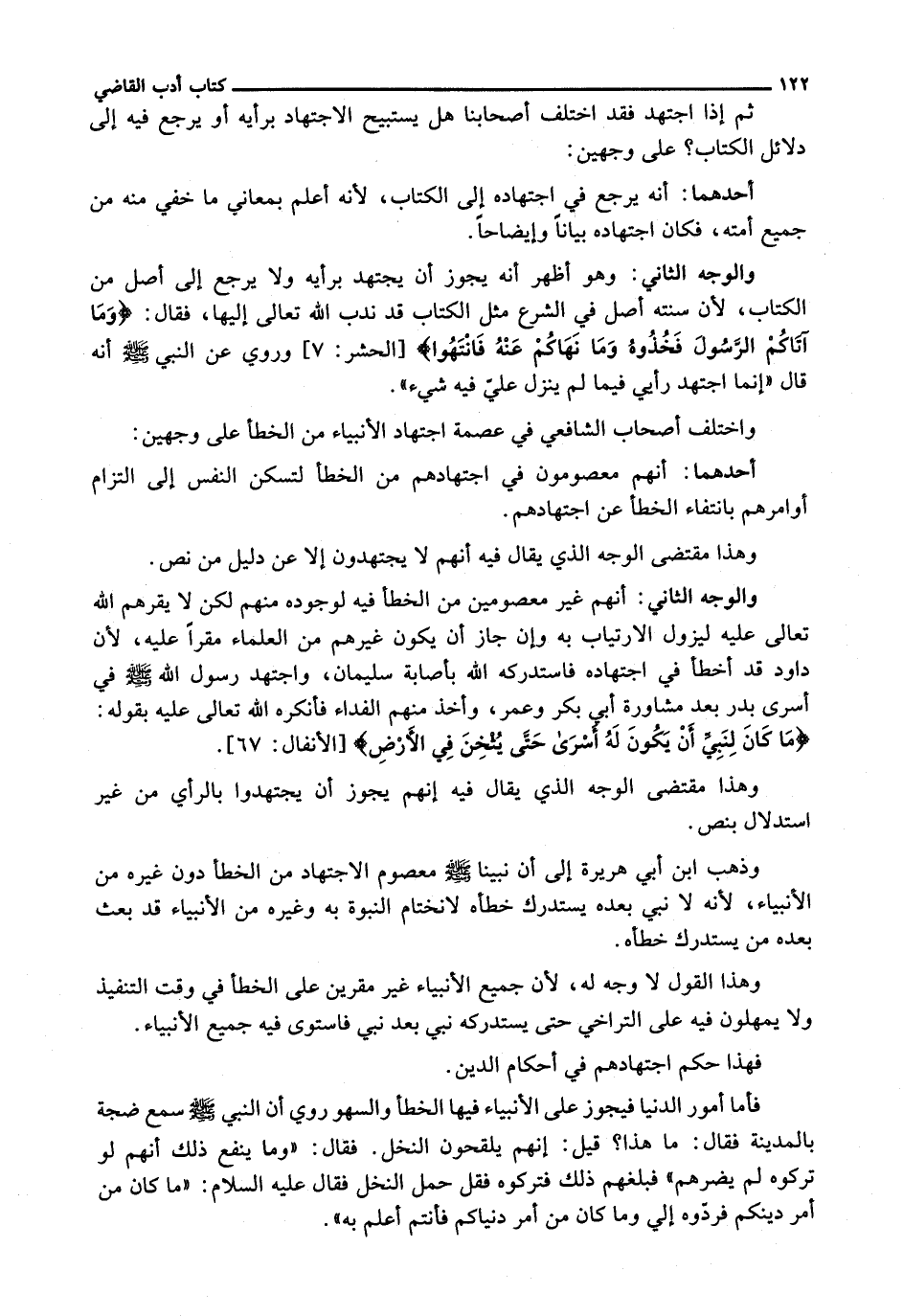وَالْوَجْهُ الثَّانِي: أَنَّهُمْ غَيْرُ مَعْصُومِينَ مِنَ الْخَطَأِ فِيهِ لِوُجُودِهِ مِنْهُمْ لَكِنْ لَا يُقِرُّهُمُ اللَّهُ تَعَالَى عَلَيْهِ لِيَزُولَ الِارْتِيَابُ بِهِ وَإِنْ جَازَ أَنْ يَكُونَ غَيْرُهُمْ مِنَ الْعُلَمَاءِ مُقِرًّا عَلَيْهِ، لِأَنَّ دَاوُدَ قَدْ أَخْطَأَ فِي اجْتِهَادِهِ فَاسْتَدْرَكَهُ اللَّهُ بِإِصَابَةِ سُلَيْمَانَ، وَاجْتَهَدَ رسول الله - صَلَّى اللَّهُ عَلَيْهِ وَسَلَّم َ - فِي أَسْرَى بَدْرٍ بَعْدَ مُشَاوَرَةِ أَبَى بَكْرٍ وَعُمَرَ، وَأَخَذَ مِنْهُمُ الْفِدَاءَ فَأَنْكَرَهُ اللَّهُ تَعَالَى عَلَيْهِ بِقَوْلِهِ: {مَا كَانَ لِنَبِيٍّ أَنْ يَكُونَ لَهُ أَسْرَى حَتَّى يُثْخِنَ فِي الأَرْضِ} [الأنفال: 67] .