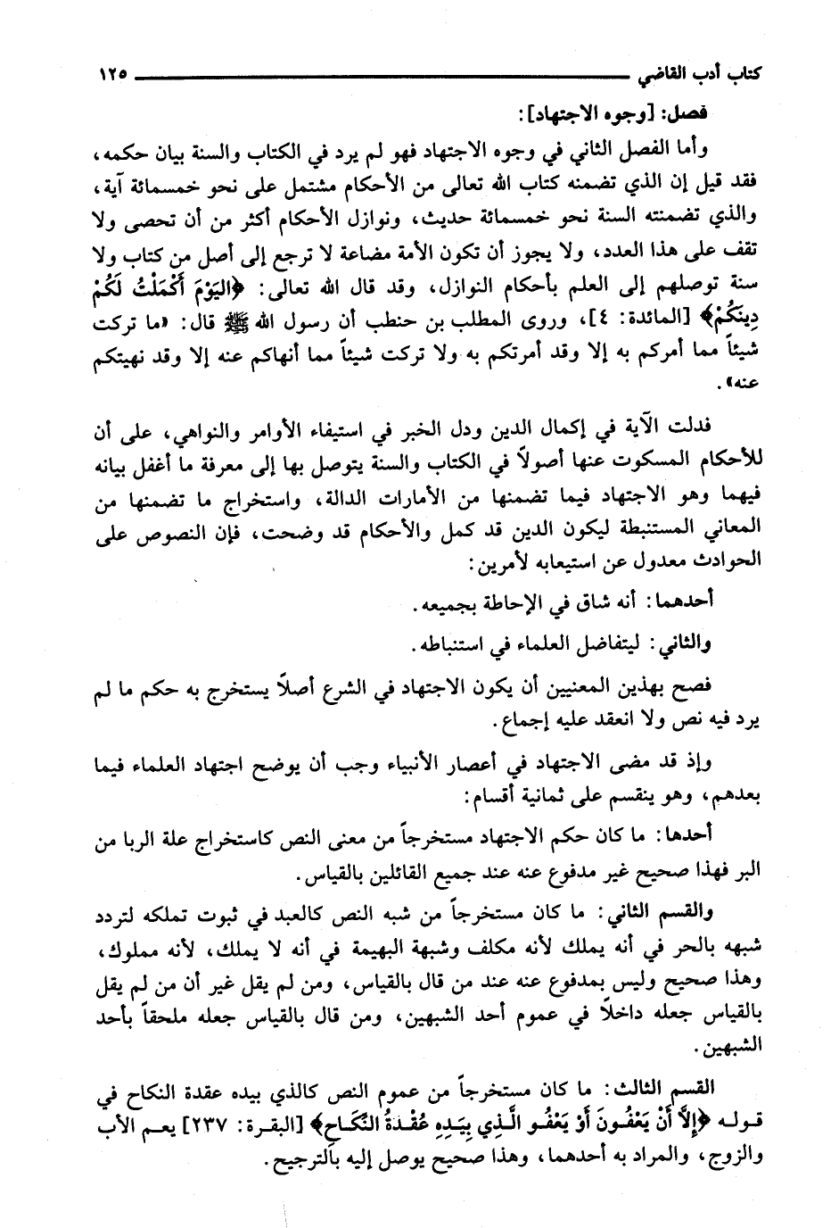 وَأَمَّا الْفَصْلُ الثَّانِي فِي وُجُوهِ الِاجْتِهَادِ فَهُوَ لَمْ يَرِدْ فِي الْكِتَابِ وَالسُّنَّةِ بَيَانُ حُكْمِهِ، فَقَدْ قِيلَ إِنَّ الَّذِي تَضَمَّنَهُ كِتَابُ اللَّهِ تَعَالَى مِنَ الْأَحْكَامِ مُشْتَمِلٌ عَلَى نَحْوِ خَمْسِمِائَةِ آيَةٍ، وَالَّذِي تَضَمَّنَتْهُ السُّنَّةُ نَحْوَ خَمْسِمِائَةِ حَدِيثٍ، وَنَوَازِلُ الْأَحْكَامِ أَكْثَرُ مِنْ أَنْ تُحْصَى وَلَا تَقِفُ عَلَى هَذَا الْعَدَدِ، وَلَا يَجُوزُ أَنْ تَكُونَ الْأُمَّةُ مُضَاعَةً لَا تَرْجِعُ إِلَى أَصْلٍ مِنْ كِتَابٍ وَلَا سُنَّةٍ تُوصِلُهُمْ إِلَى الْعِلْمِ بِأَحْكَامِ النَّوَازِلِ، وَقَدْ قَالَ اللَّهُ تَعَالَى: {الْيَوْمَ أَكْمَلْتُ لَكُمْ دِينَكُمْ} [المائدة: 4] ، وَرَوَى الْمُطَّلِبُ بْنُ حَنْطَبٍ أَنَّ رَسُولَ اللَّهِ - صَلَّى اللَّهُ عَلَيْهِ وَسَلَّم َ - قال: " ما تركت شيئا مما أمركم بِهِ إِلَّا وَقَدْ أَمَرْتُكُمْ بِهِ وَلَا تَرَكْتُ شَيْئًا مِمَّا أَنْهَاكُمْ عَنْهُ إِلَّا وَقَدْ نَهَيْتُكُمْ عَنْهُ ".