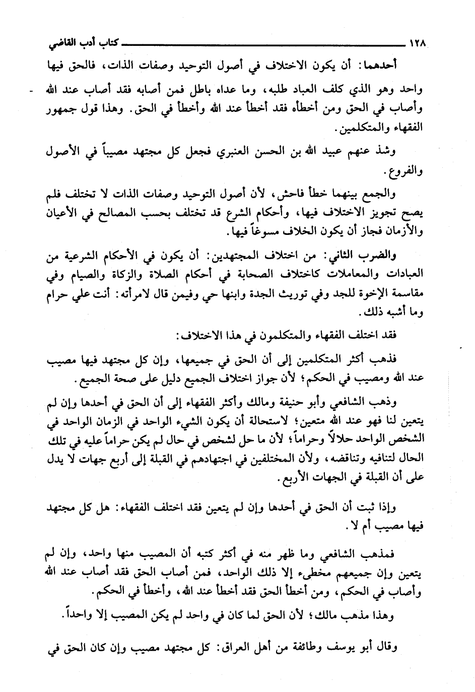 أَحَدُهُمَا: أَنْ يَكُونَ الِاخْتِلَافُ فِي أُصُولِ التَّوْحِيدِ وَصِفَاتِ الذَّاتِ، فَالْحَقُّ فِيهَا وَاحِدٌ وَهُوَ الَّذِي كُلِّفَ الْعِبَادُ طَلَبَهُ، وَمَا عَدَاهُ بَاطِلٌ فَمَنْ أَصَابَهُ فَقَدْ أَصَابَ عِنْدَ اللَّهِ وَأَصَابَ فِي الْحَقِّ وَمَنْ أَخْطَأَهُ فَقَدْ أَخْطَأَ عِنْدَ اللَّهِ وَأَخْطَأَ فِي الْحَقِّ. وَهَذَا قَوْلُ جُمْهُورِ الْفُقَهَاءِ وَالْمُتَكَلِّمِينَ.
