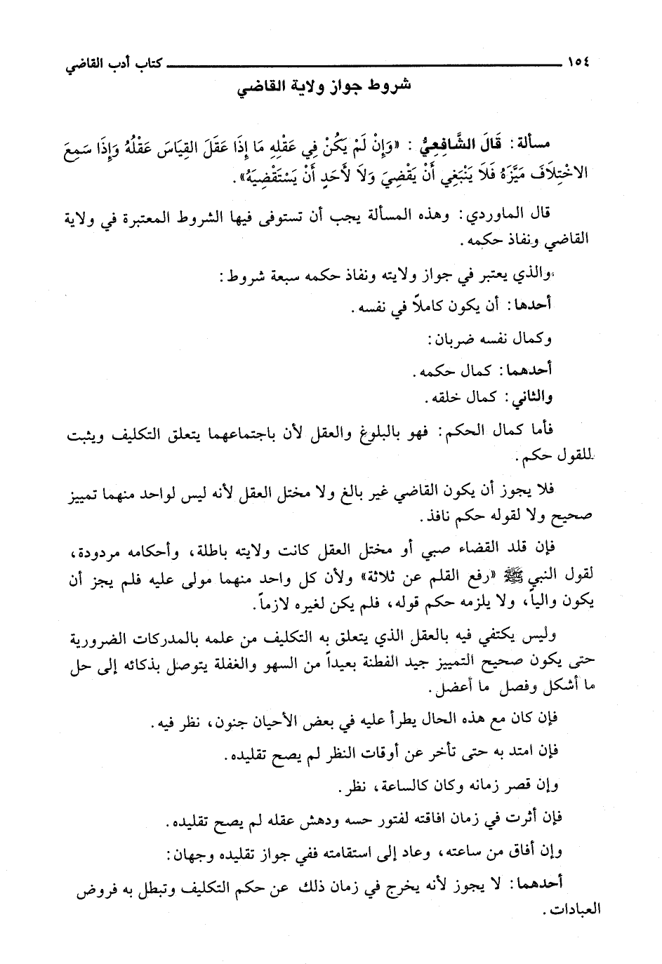 قَالَ الْمَاوَرْدِيُّ: وَهَذِهِ الْمَسْأَلَةُ يَجِبُ أَنْ تُسْتَوْفَى فِيهَا الشُّرُوطُ الْمُعْتَبَرَةُ فِي وِلَايَةِ الْقَاضِي وَنَفَاذِ حُكْمِهِ.