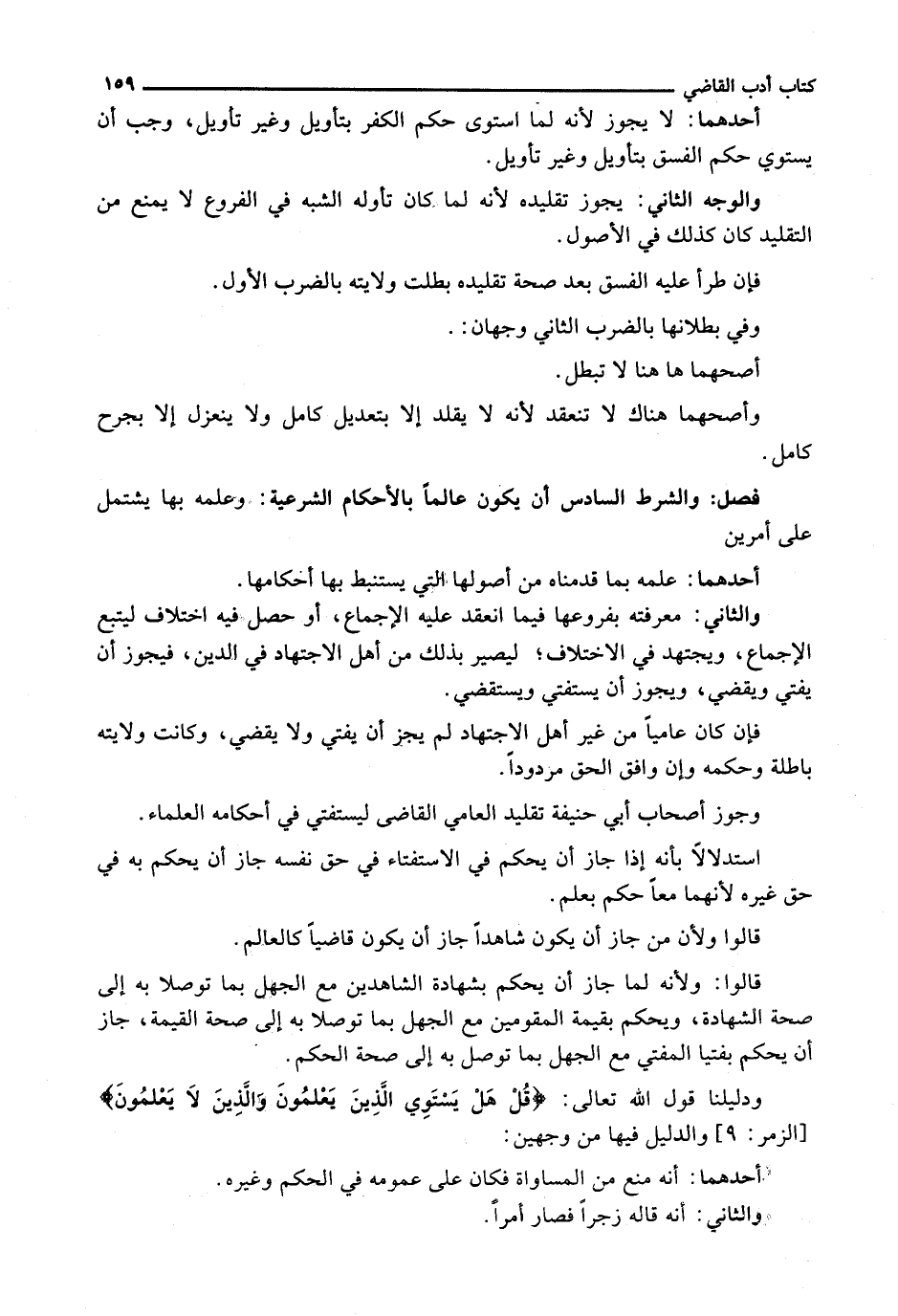 : وَالشَّرْطُ السَّادِسُ أَنْ يَكُونَ عَالِمًا بِالْأَحْكَامِ الشَّرْعِيَّةِ: وَعِلْمُهُ بِهَا يَشْتَمِلُ عَلَى أَمْرَيْنِ