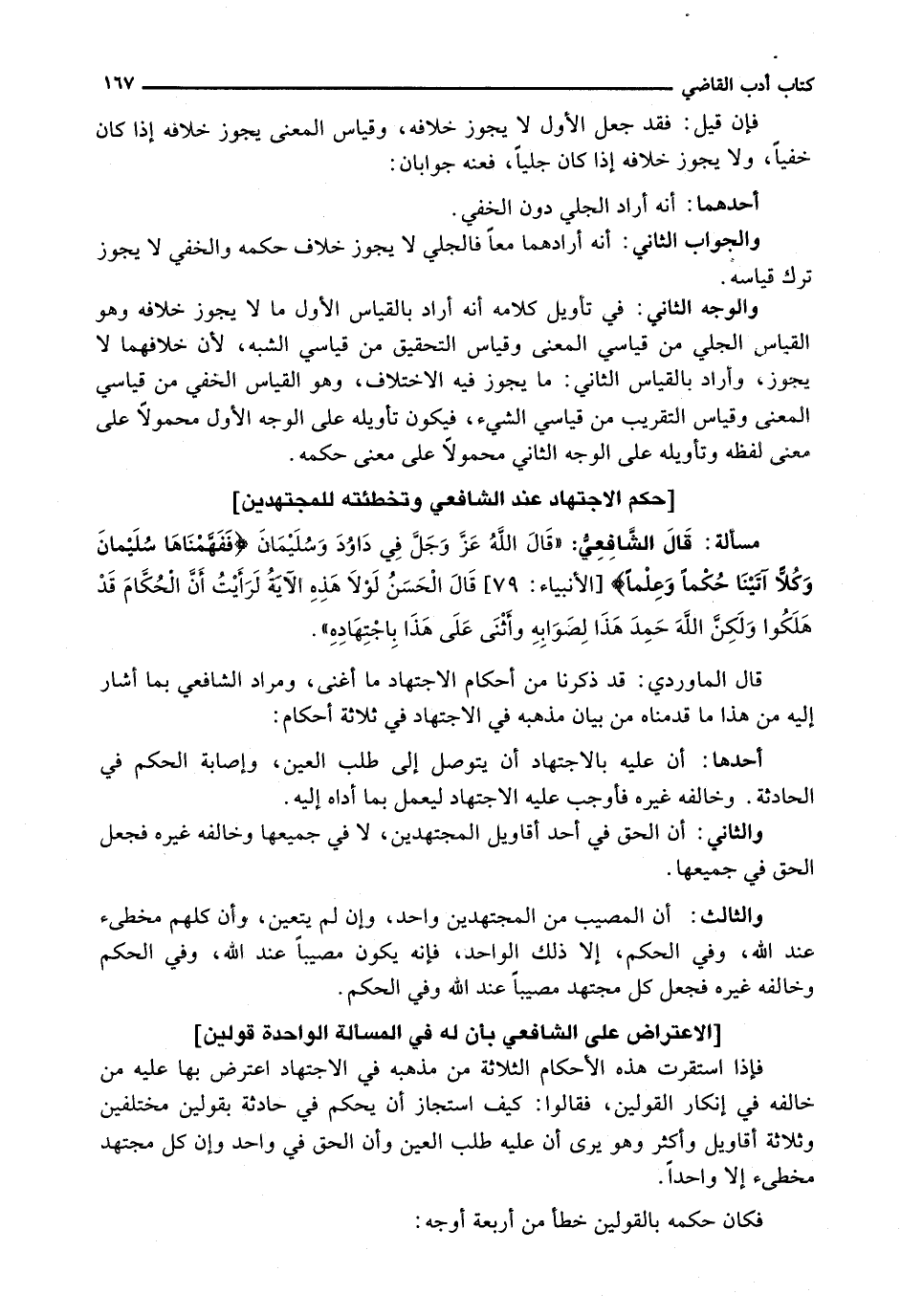 : قَالَ الشَّافِعِيُّ: " قَالَ اللَّهُ عَزَّ وَجَلَّ فِي دَاوُدَ وَسُلَيْمَانَ {فَفَهَّمْنَاهَا سُلَيْمَانَ وَكُلا آتَيْنَا حُكْمًا وَعِلْمًا} [الأنبياء: 79] قَالَ الْحَسَنُ لَوْلَا هَذِهِ الْآيَةُ لَرَأَيْتُ أَنَّ الْحُكَّامَ قَدْ هَلَكُوا وَلَكِنَّ اللَّهَ حَمِدَ هَذَا لِصَوَابِهِ وَأَثْنَى عَلَى هَذَا بِاجْتِهَادِهِ ".
