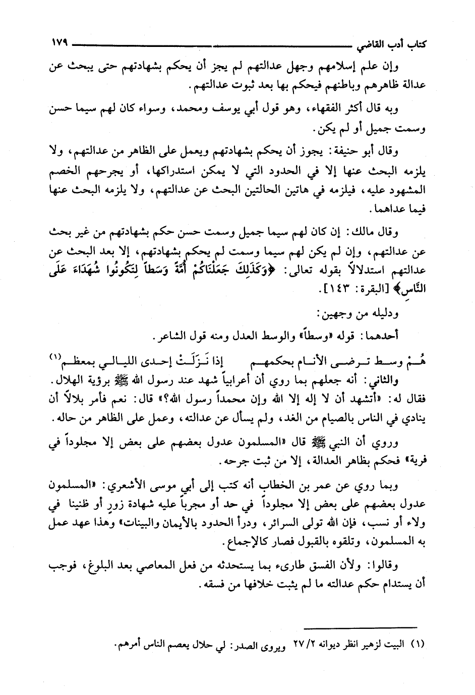 وَبِمَا رُوِيَ عَنْ عُمَرَ بْنِ الْخَطَّابِ أَنَّهُ كَتَبَ إِلَى أَبِي مُوسَى الْأَشْعَرِيِّ: " الْمُسْلِمُونَ عُدُولٌ بَعْضُهُمْ عَلَى بَعْضٍ إِلَّا مَجْلُودًا فِي حَدٍّ أَوْ مُجَرَّبًا عَلَيْهِ شَهَادَةُ زُورٍ أَوْ ظَنِينًا فِي وَلَاءٍ أَوْ نَسَبٍ، فَإِنَّ اللَّهَ تَوَلَّى السَّرَائِرَ، وَدَرَأَ الْحُدُودَ بِالْأَيْمَانِ وَالْبَيِّنَاتِ " وَهَذَا عَهْدٌ عَمِلَ بِهِ الْمُسْلِمُونَ، وَتَلَقَّوْهُ بِالْقَبُولِ فَصَارَ كَالْإِجْمَاعِ.