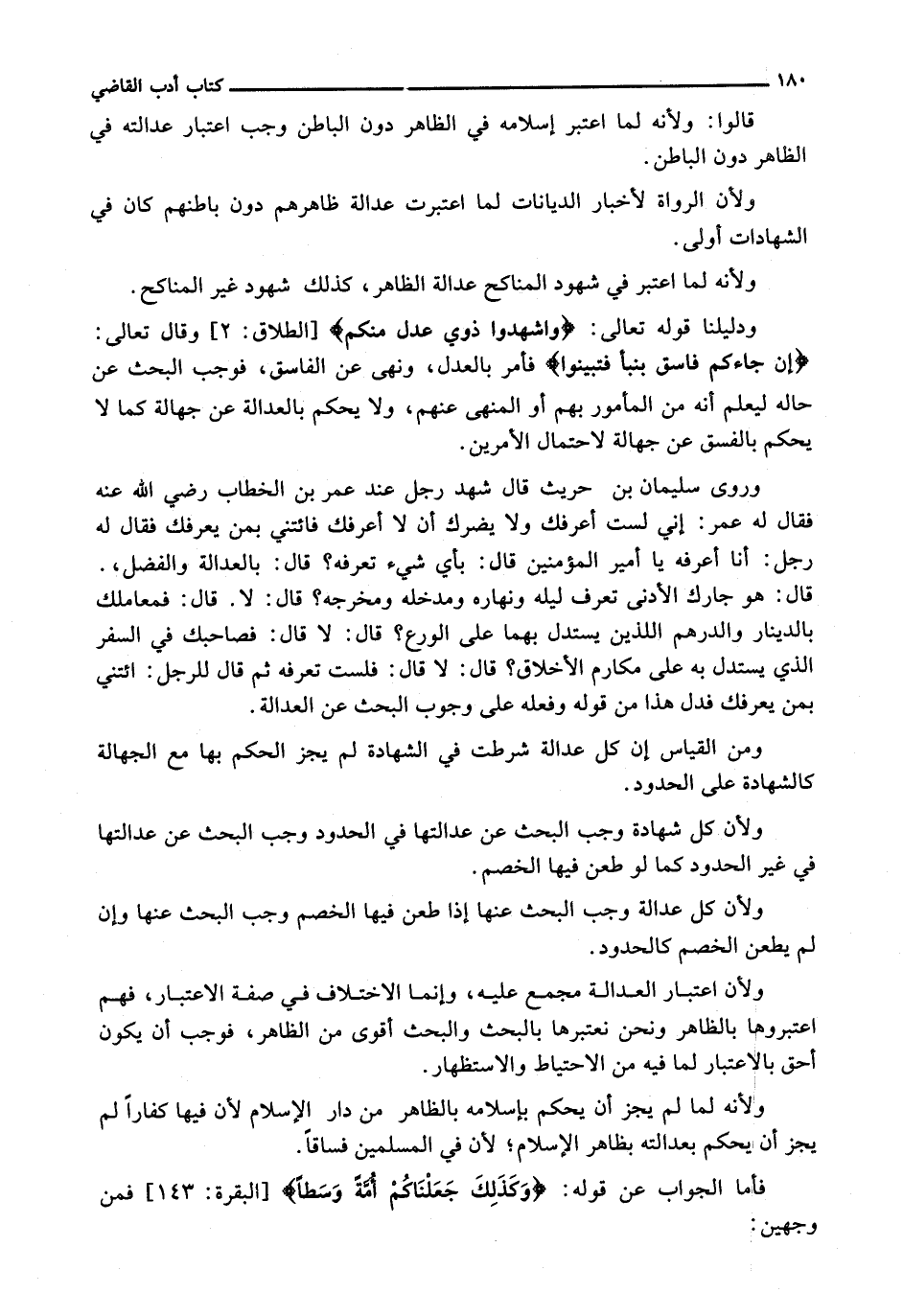 وَرَوَى سُلَيْمَانُ بْنُ حُرَيْثٍ قَالَ شَهِدَ رَجُلٌ عِنْدَ عُمَرَ بْنَ الْخَطَّابِ رَضِيَ اللَّهُ عَنْهُ فَقَالَ لَهُ عُمَرُ: إِنِّي لَسْتُ أَعْرِفُكَ وَلَا يَضُرُّكَ أَنْ لَا أَعْرِفَكَ فَائْتِنِي بِمَنْ يَعْرِفُكَ فَقَالَ لَهُ رَجُلٌ: أَنَا أَعْرِفُهُ يَا أَمِيرَ الْمُؤْمِنِينَ قَالَ: بِأَيِّ شَيْءٍ تَعْرِفُهُ؟ قَالَ: بِالْعَدَالَةِ وَالْفَضْلِ،. قَالَ: هُوَ جَارُكَ الْأَدْنَى تَعْرِفُ لَيْلَهُ وَنَهَارَهُ وَمَدْخَلَهُ وَمَخْرَجَهُ؟ قَالَ: لَا. قَالَ: فَمُعَامِلُكَ بِالدِّينَارِ وَالدِّرْهَمِ اللَّذَيْنِ يُسْتَدَلُّ بِهِمَا عَلَى الْوَرَعِ؟ قَالَ: لَا قَالَ: فَصَاحِبُكَ فِي السَّفَرِ الَّذِي يُسْتَدَلُّ بِهِ عَلَى مَكَارِمِ الْأَخْلَاقِ؟ قَالَ: لَا قَالَ: فَلَسْتَ تَعْرِفُهُ ثُمَّ قَالَ لِلرَّجُلِ: ائْتِنِي بِمَنْ يَعْرِفُكَ فَدَلَّ هَذَا مِنْ قَوْلِهِ وَفِعْلِهِ عَلَى وُجُوبِ الْبَحْثِ عَنِ الْعَدَالَةِ.