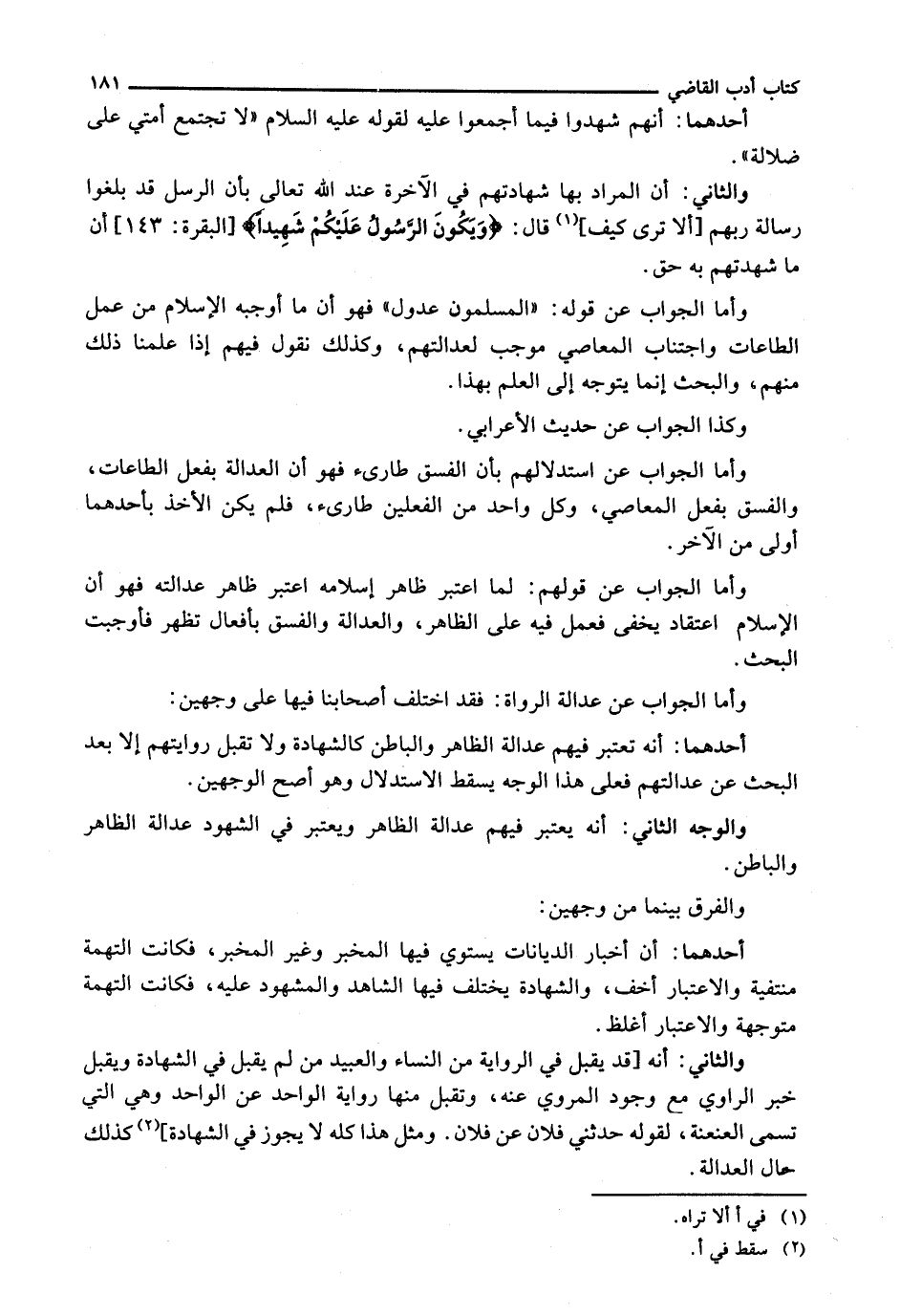 وَأَمَّا الْجَوَابُ عَنْ قَوْلِهِ: " الْمُسْلِمُونَ عُدُولٌ " فَهُوَ أَنَّ مَا أَوْجَبَهُ الْإِسْلَامُ مِنْ عَمَلِ الطَّاعَاتِ وَاجْتِنَابِ الْمَعَاصِي مُوجِبٌ لِعَدَالَتِهِمْ، وَكَذَلِكَ نَقُولُ فِيهِمْ إِذَا عَلِمْنَا ذَلِكَ مِنْهُمْ، وَالْبَحْثُ إِنَّمَا يَتَوَجَّهُ إِلَى الْعِلْمِ بِهَذَا.