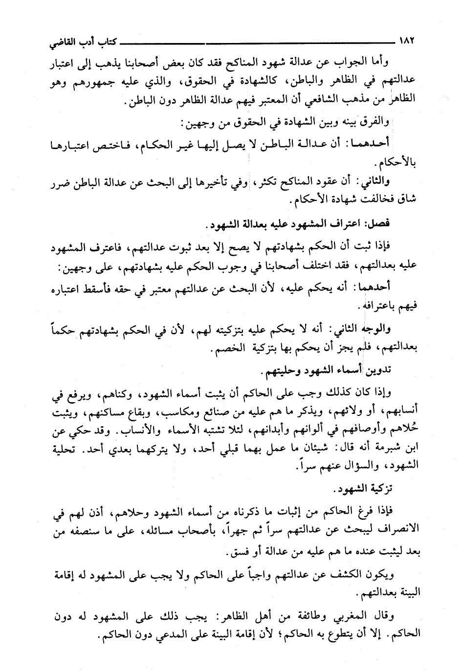 وَإِذَا كَانَ كَذَلِكَ وَجَبَ عَلَى الْحَاكِمِ أَنْ يُثْبِتَ أَسْمَاءَ الشُّهُودِ، وَكُنَاهُمْ، وَيَرْفَعَ فِي أَنْسَابِهِمْ، أَوْ وَلَائِهِمْ، وَيَذْكُرَ مَا هُمْ عَلَيْهِ مِنْ صَنَائِعَ وَمَكَاسِبَ، وَبِقَاعِ مَسَاكِنِهِمْ، وَيُثْبِتَ حُلَاهُمْ وَأَوْصَافَهُمْ فِي أَلْوَانِهِمْ وَأَبْدَانِهِمْ، لِئَلَّا تُشْتَبَهُ الْأَسْمَاءُ وَالْأَنْسَابُ. وَقَدْ حُكِيَ عَنِ ابْنِ شُبْرُمَةَ أَنَّهُ قَالَ: شَيْئَانِ مَا عَمِلَ بِهِمَا قَبْلِي أَحَدٌ، وَلَا يَتْرُكُهُمَا بَعْدِي أَحَدٌ. تَحْلِيَةُ الشُّهُودِ، وَالسُّؤَالُ عَنْهُمْ سرا.