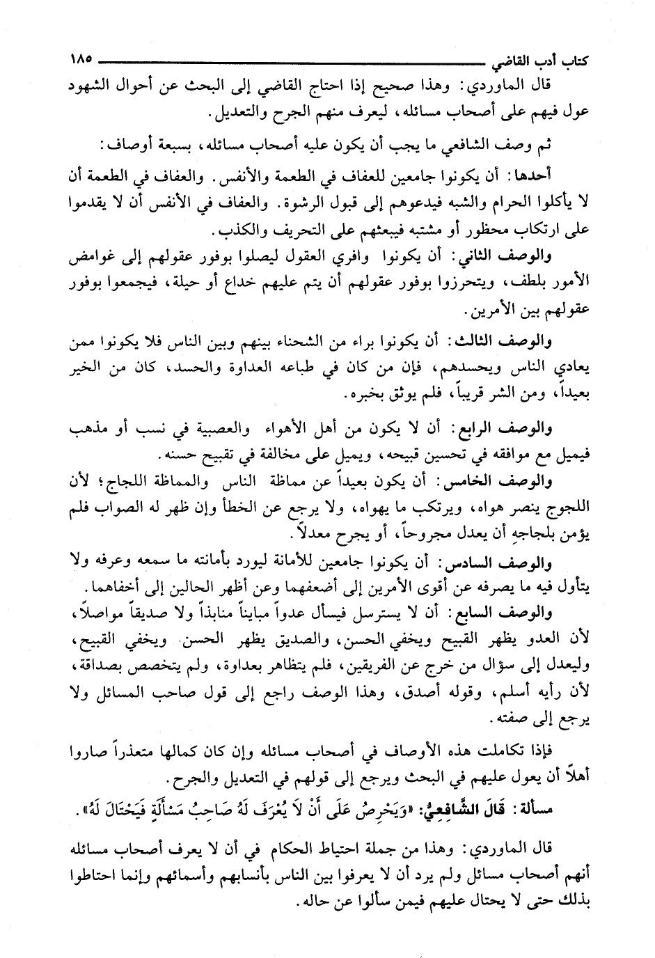 وَالْوَصْفُ السَّابِعُ: أَنْ لَا يَسْتَرْسِلَ فَيَسْأَلَ عَدُوًّا مُبَايِنًا مُنَابِذًا وَلَا صَدِيقًا مُوَاصِلًا، لِأَنَّ الْعَدُوَّ يُظْهِرُ الْقَبِيحَ وَيُخْفِي الْحَسَنَ، وَالصَّدِيقُ يُظْهِرُ الْحَسَنَ وَيُخْفِي الْقَبِيحَ، وَلِيَعْدِلْ إِلَى سُؤَالِ مَنْ خَرَجَ عَنِ الْفَرِيقَيْنِ، فَلَمْ يَتَظَاهَرْ بِعَدَاوَةٍ، وَلَمْ يَتَخَصَّصْ بِصَدَاقَةٍ، لِأَنَّ رَأْيَهُ أَسْلَمُ، وَقَوْلَهُ أَصْدَقُ، وَهَذَا الْوَصْفُ رَاجِعٌ إِلَى قَوْلِ صَاحِبِ الْمَسَائِلِ وَلَا يَرْجِعُ إِلَى صِفَتِهِ.