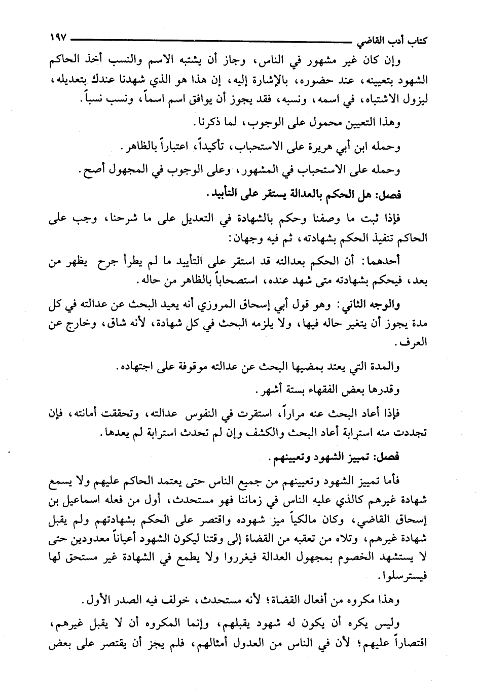 فَأَمَّا تَمْيِيزُ الشُّهُودِ وَتَعْيِينُهُمْ مِنْ جَمِيعِ النَّاسِ حَتَّى يَعْتَمِدَ الْحَاكِمُ عَلَيْهِمْ وَلَا يَسْمَعَ شَهَادَةَ غَيْرِهِمْ كَالَّذِي عَلَيْهِ النَّاسُ فِي زَمَانِنَا فَهُوَ مُسْتَحْدَثٌ، أَوَّلُ مَنْ فَعَلَهُ إِسْمَاعِيلُ بْنُ إِسْحَاقَ الْقَاضِي، وَكَانَ مَالِكِيًّا مَيَّزَ شُهُودَهُ وَاقْتَصَرَ عَلَى الْحُكْمِ بِشَهَادَتِهِمْ وَلَمْ يَقْبَلْ شَهَادَةَ غَيْرِهِمْ، وَتَلَاهُ مَنْ تَعَقَّبَهُ مِنَ الْقُضَاةِ إِلَى وَقْتِنَا لِيَكُونَ الشُّهُودُ أَعْيَانًا مَعْدُودِينَ حَتَّى لَا يَسْتَشْهِدَ الْخُصُومَ بِمَجْهُولِ الْعَدَالَةِ فَيُغَرِّرُوا وَلَا يَطْمَعُ فِي الشَّهَادَةِ غَيْرُ مُسْتَحِقٍّ لَهَا فَيَسْتَرْسِلُوا.