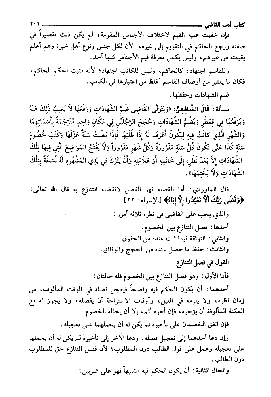 قَالَ الْمَاوَرْدِيُّ: أَمَّا الْقَضَاءُ فَهُوَ الْفَصْلُ لِانْقِضَاءِ التَّنَازُعِ بِهِ قَالَ اللَّهِ تَعَالَى: {وَقَضَى رَبُّكَ أَلا تَعْبُدُوا إِلا إِيَّاهُ} [الإسراء: 22] .