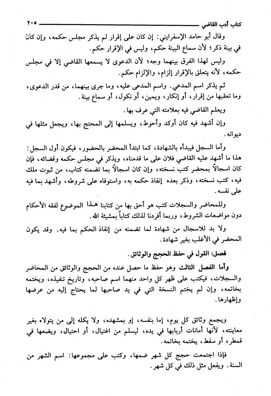 وَأَمَّا الْفَصْلُ الثَّالِثُ وَهُوَ حِفْظُ مَا حَصَلَ عِنْدَهُ مِنَ الْحُجَجِ وَالْوَثَائِقِ مِنَ الْمَحَاضِرِ وَالسِّجِلَّاتِ، فَيُكْتَبُ عَلَى ظَهْرِ كُلِّ وَاحِدٍ مِنْهُمَا اسْمُ صَاحِبِهِ، وَتَارِيخُ تَنْفِيذِهِ، وَيَخْتِمُهُ بِخَاتَمِهِ، وَإِنْ لَمْ يَخْتِمِ النُّسْخَةَ الَّتِي فِي يَدِ صَاحِبِهَا لِمَا يَحْتَاجُ إِلَيْهِ مِنْ عَرْضِهَا وَإِظْهَارِهَا.