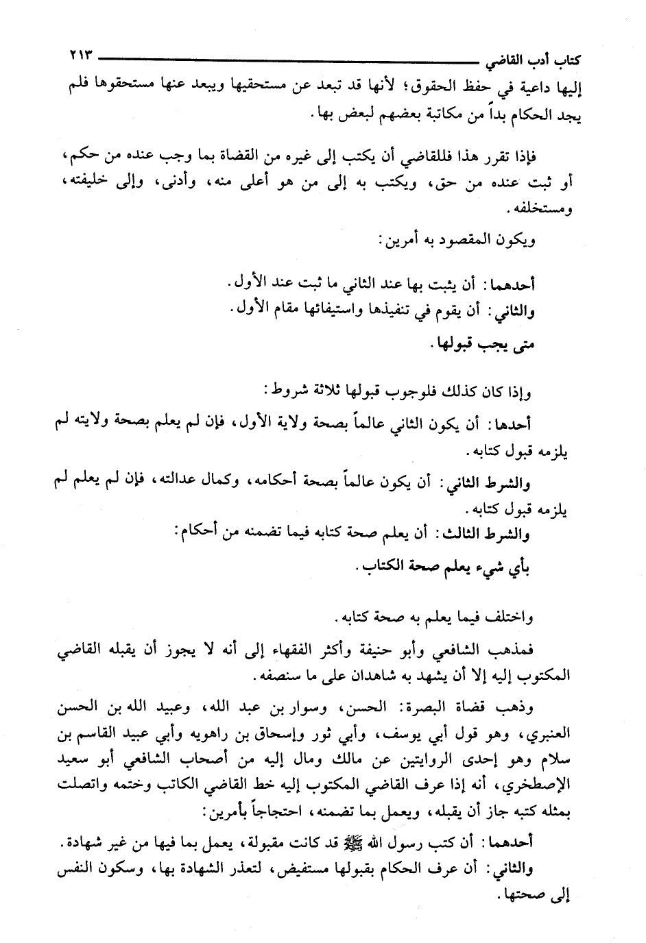 فَمَذْهَبُ الشَّافِعِيِّ وأبو حَنِيفَةَ وَأَكْثَرِ الْفُقَهَاءِ إِلَى أَنَّهُ لَا يَجُوزُ أَنْ يَقْبَلَهُ الْقَاضِي الْمَكْتُوبُ إِلَيْهِ إِلَّا أَنْ يَشْهَدَ بِهِ شَاهِدَانِ عَلَى مَا سَنصفهُ.