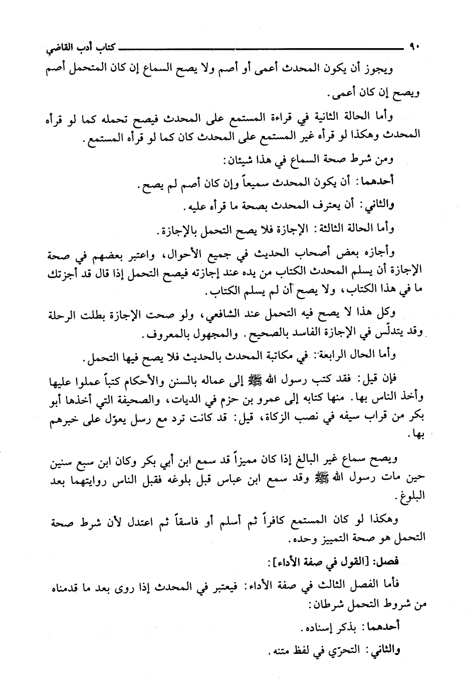 فَأَمَّا الْفَصْلُ الثَّالِثُ فِي صِفَةِ الْأَدَاءِ: فَيُعْتَبَرُ فِي الْمُحَدِّثِ إِذَا رَوَى بَعْدَ مَا قَدَّمْنَاهُ مِنْ شُرُوطِ التَّحَمُّلِ شَرْطَانِ: