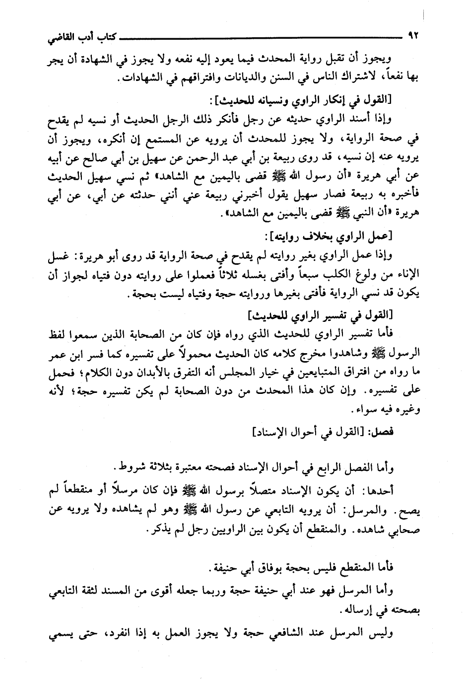 وَإِذَا أَسْنَدَ الرَّاوِي حَدِيثَهُ عَنْ رَجُلٍ فَأَنْكَرَ ذَلِكَ الرَّجُلُ الْحَدِيثَ أَوْ نَسِيَهُ لَمْ يَقْدَحْ فِي صِحَّةِ الرِّوَايَةِ، وَلَا يَجُوزُ لِلْمُحَدِّثِ أَنْ يَرْوِيَهُ عَنِ الْمُسْتَمِعِ إِنْ أَنْكَرَهُ، وَيَجُوزَ أَنْ يَرْوِيَهُ عَنْهُ إِنْ نَسِيَهُ، قَدْ رَوَى رَبِيعَةُ بْنُ أَبِي عَبْدِ الرَّحْمَنِ عَنْ سُهَيْلِ بْنِ أَبِي صَالِحٍ عَنْ أَبِيهِ عَنْ أَبِي هُرَيْرَةَ " أَنَّ رَسُولَ اللَّهِ - صَلَّى اللَّهُ عَلَيْهِ وَسَلَّم َ - قَضَى بِالْيَمِينِ مَعَ الشَّاهِدِ " ثُمَّ نَسِيَ سُهَيْلٌ الْحَدِيثَ فَأَخْبَرَهُ بِهِ رَبِيعَةُ فَصَارَ سُهَيْلٌ يَقُولُ أَخْبَرَنِي رَبِيعَةُ عَنِّي أَنَّنِي حَدَّثْتُهُ عَنْ أَبِي، عَنْ أَبِي هُرَيْرَةَ " أَنَّ النَّبِيَّ - صَلَّى اللَّهُ عَلَيْهِ وَسَلَّم َ - قضى باليمين مع الشاهد ".