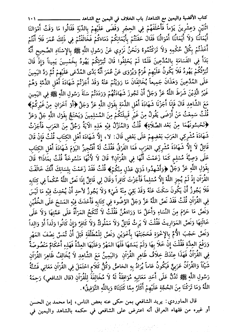 اثنين وعشرين يوما فأحلفهم في الحجر وَقَضَى عَلَيْهِمْ بِالدِّيَةِ فَقَالُوا مَا وَقَتْ أَمْوَالَنَا أَيْمَانَنَا وَلَا أَيْمَانُنَا أَمْوَالَنَا فَقَالَ حَقَنْتُمْ بأيمانكم دماءكم فخالفتم في ذلك عمر فلا أنتم أخذتم بكل حكمه ولا تركتموه ونحن نروي عَنْ رَسُولِ اللَّهِ - صَلَّى اللَّهُ عَلَيْهِ وَسَلَّم َ - بالإسناد الصحيح أنه بدأ في القسامة بالمدعين فلما لم يحلفوا قال تبرئكم يهود بخمسين يمينا وإذ قال تبرئكم يهود فلا يكون عليهم غرم ويروى عن عمر أنه بدى المدعى عليهم ثم رد اليمين على المدعين وهذان جميعا يخالفان ما رويتم عنه وَقَدْ أَجَزْتُمْ شَهَادَةَ أَهْلِ الذِّمَّةِ وَهُمْ غَيْرُ الذين شرط الله عز وجل أَنْ تَجُوزَ شَهَادَتُهُمْ وَرَدَدْتُمْ سُنَّةُ رَسُولِ اللَّهِ - صَلَّى اللَّهُ عَلَيْهِ وَسَلَّم َ - في اليمين مع الشاهد قال فإنا أجزنا شهادة أهل الذمة بقول الله عز وجل {أو آخران من غيركم} قلت سمعت من أرضى يقول من غير قبيلتكم من المسلمين ويحتج بقول الله جل وعز {تحبسونهما من بعد الصلاة} قلت والمنزل فيه هذه الآية رجل من العرب فأجزت شهادة مشركي العرب بعضهم على بعض قال: لا، إلا شهادة أهل الكتاب قلت فإن قال قائل لا إلا شهادة مشركي العرب فما الفرق فقلت له أفتجيز اليوم شهادة أهل الكتاب على وصية مسلم كما زعمت أنها في القرآن؟ قال لا لأنها منسوخة قلت بماذا؟ قال بقول الله عز وجل {وأشهدوا ذوي عدل منكم} قلت فقد زعمت بلسانك أنك خالفت القرآن إذ لم يجز الله إلا مسلما فأجزت كافرا وقال لي قائل إذا نص الله حُكْمًا فِي كِتَابِهِ فَلَا يَجُوزُ أَنْ يَكُونَ سَكَتَ عَنْهُ وَقَدْ بَقِيَ مِنْهُ شَيْءٌ وَلَا يَجُوزُ لِأَحَدٍ أَنْ يُحْدِثَ فِيهِ مَا لَيْسَ في القرآن قلت فقد نص الله عز وجل الوضوء في كتابه فأحدث فِيهِ الْمَسْحَ عَلَى الْخُفَّيْنِ وَنَصَّ مَا حَرَّمَ من النساء وَأَحَلَّ مَا وَرَاءَهُنَّ فَقُلْتَ لَا تُنْكَحُ الْمَرْأَةُ عَلَى عَمَّتِهَا وَلَا عَلَى خَالَتِهَا وَنَصَّ الْمَوَارِيثَ فقلت لَا يَرِثُ قَاتِلٌ وَلَا مَمْلُوكٌ وَلَا كَافِرٌ وإن كانوا ولدا أو والدا ونص حجب الأم بالإخوة فحجبتها بِأَخَوَيْنِ وَنَصَّ لِلْمُطَلَّقَةِ قَبْلَ أَنْ تُمَسَّ نِصْفَ المهر ورفع العدة فقلت إِنْ خَلَا بِهَا وَلَمْ يَمَسَّهَا فَلَهَا الْمَهْرُ وَعَلَيْهَا الْعِدَّةُ فَهَذِهِ أَحْكَامٌ مَنْصُوصَةٌ فِي الْقُرْآنِ فَهَذَا عِنْدَكَ خِلَافُ ظَاهِرِ الْقُرْآنِ وَالْيَمِينُ مَعَ الشاهد لا يخالف ظاهر القرآن شيئا والقرآن عربي فيكون عاما يُرَادُ بِهِ الْخَاصَّ وَكُلُّ كَلَامٍ احْتَمَلَ فِي الْقُرْآنِ مَعَانِيَ فَسُنَّةُ رَسُولِ اللَّهِ - صَلَّى اللَّهُ عَلَيْهِ وَسَلَّم َ - تَدُلُّ عَلَى أَحَدِ مَعَانِيهِ مُوافِقَةً لَهُ لَا مخالفة للقرآن (قال الشافعي) رحمه الله وما تركنا من الحجة عليهم أكثر مما كتبناه وبالله التوفيق ".