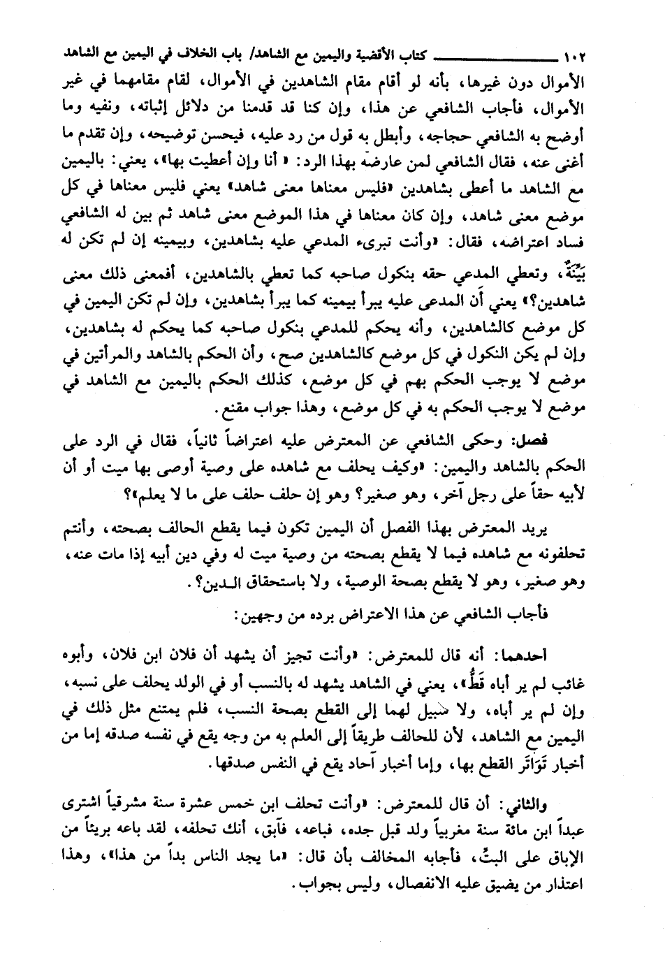 الْأَمْوَالِ دُونَ غَيْرِهَا، بِأَنَّهُ لَوْ أَقَامَ مَقَامَ الشَّاهِدَيْنِ فِي الْأَمْوَالِ، لَقَامَ مَقَامَهُمَا فِي غَيْرِ الْأَمْوَالِ، فَأَجَابَ الشَّافِعِيُّ عَنْ هَذَا، وَإِنْ كُنَّا قَدْ قَدَّمْنَا مِنْ دَلَائِلِ إِثْبَاتِهِ، وَنَفْيِهِ وَمَا أَوْضَحَ بِهِ الشَّافِعِيُّ حِجَاجَهُ، وَأَبْطَلَ بِهِ قَوْلَ مَنْ رَدَّ عَلَيْهِ، فَيَحْسُنُ تَوْضِيحُهُ، وَإِنْ تَقَدَّمَ مَا أَغْنَى عَنْهُ، فَقَالَ الشَّافِعِيُّ لِمَنْ عَارَضَهُ بِهَذَا الرَّدِّ: " أَنَا وَإِنْ أَعْطَيْتُ بِهَا "، يَعْنِي: بِالْيَمِينِ مَعَ الشَّاهِدِ مَا أُعْطِي بِشَاهِدَيْنِ " فَلَيْسَ مَعْنَاهَا مَعْنَى شَاهِدٍ " يَعْنِي فَلَيْسَ مَعْنَاهَا فِي كُلِّ مَوْضِعٍ مَعْنَى شَاهِدٍ، وَإِنْ كَانَ مَعْنَاهَا فِي هَذَا الْمَوْضِعِ مَعْنَى شَاهِدٍ ثُمَّ بَيَّنَ له الشافعي فساد اعتراضه، فقال: " وأنت تبرىء الْمُدَّعَى عَلَيْهِ بِشَاهِدَيْنِ، وَبِيَمِينِهِ إِنْ لَمْ تَكُنْ لَهُ بَيِّنَةٌ، وَتُعْطِي الْمُدَّعِيَ حَقَّهُ بِنُكُولِ صَاحِبِهِ كَمَا تُعْطِي بِالشَّاهِدَيْنِ، أَفَمَعْنَى ذَلِكَ مَعْنَى شَاهِدَيْنِ؟ " يَعْنِي أَنَّ الْمُدَّعَى عَلَيْهِ يَبْرَأُ بِيَمِينِهِ كَمَا يبرأ بشاهدين، وإن لم تكن اليمين فِي كُلِّ مَوْضِعٍ كَالشَّاهِدَيْنِ، وَأَنَّهُ يُحْكَمُ لِلْمُدَّعِي بِنُكُولِ صَاحِبِهِ كَمَا يُحْكَمُ لَهُ بِشَاهِدَيْنِ، وَإِنْ لَمْ يَكُنِ النُّكُولُ فِي كُلِّ مَوْضِعٍ كَالشَّاهِدَيْنِ صَحَّ، وَأَنَّ الْحُكْمَ بِالشَّاهِدِ وَالْمَرْأَتَيْنِ فِي مَوْضِعٍ لَا يُوجِبُ الْحُكْمَ بِهِمْ فِي كُلِّ مَوْضِعٍ، كَذَلِكَ الْحُكْمُ بِالْيَمِينِ مَعَ الشَّاهِدِ فِي مَوْضِعٍ لَا يُوجِبُ الْحُكْمَ بِهِ فِي كُلِّ مَوْضِعٍ، وَهَذَا جَوَابٌ مُقْنِعٌ.