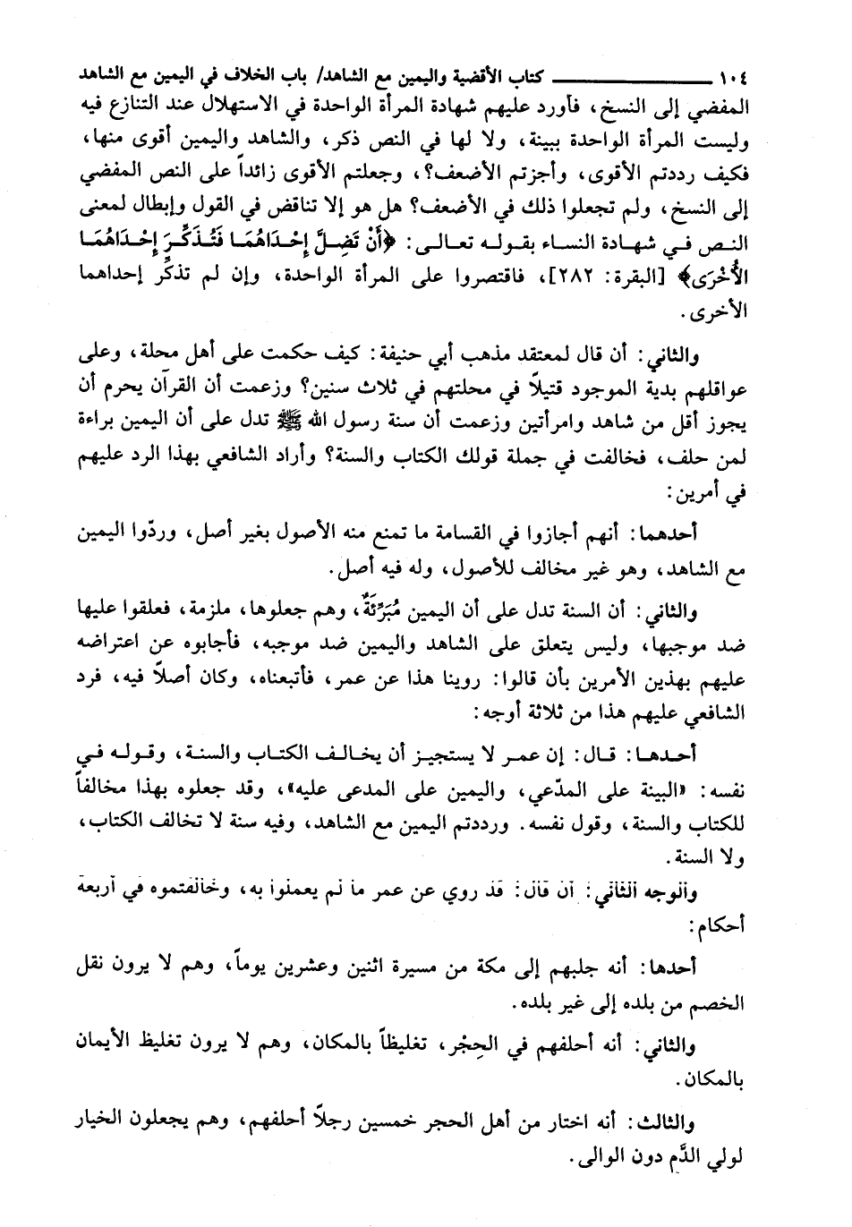 الْمُفْضِي إِلَى النَّسْخِ، فَأَوْرَدَ عَلَيْهِمْ شَهَادَةَ الْمَرْأَةِ الْوَاحِدَةِ فِي الِاسْتِهْلَالِ عِنْدَ التَّنَازُعِ فِيهِ وَلَيْسَتِ الْمَرْأَةُ الْوَاحِدَةُ بِبَيِّنَةٍ، وَلَا لَهَا فِي النَّصِّ ذِكْرٌ، وَالشَّاهِدُ وَالْيَمِينُ أَقْوَى مِنْهَا، فَكَيْفَ رَدَدْتُمُ الْأَقْوَى، وَأَجَزْتُمُ الْأَضْعَفَ؟ ، وَجَعَلْتُمُ الْأَقْوَى زَائِدًا عَلَى النَّصِّ الْمُفْضِي إِلَى النَّسْخِ، وَلَمْ تَجْعَلُوا ذَلِكَ فِي الْأَضْعَفِ؟ هَلْ هُوَ إِلَّا تَنَاقُضٌ فِي الْقَوْلِ وَإِبْطَالٌ لِمَعْنَى النَّصِّ فِي شَهَادَةِ النِّسَاءِ بِقَوْلِهِ تَعَالَى: {أَنْ تَضِلَّ إِحْدَاهُمَا فَتُذَكِّرَ إِحْدَاهُمَا الأُخْرَى} [البقرة: 282] ، فَاقْتَصَرُوا عَلَى الْمَرْأَةِ الْوَاحِدَةِ، وَإِنْ لَمْ تُذَكِّرْ إِحْدَاهُمَا الْأُخْرَى.