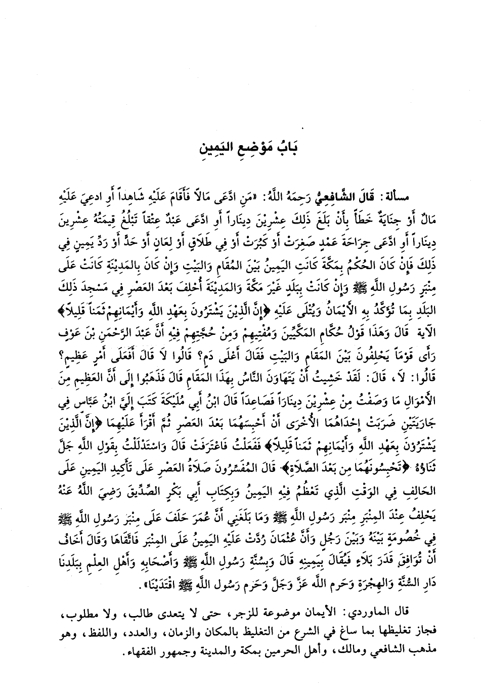: قَالَ الشَّافِعِيُّ رَحِمَهُ اللَّهُ: " مَنِ ادَّعَى مَالًا فَأَقَامَ عَلَيْهِ شَاهِدًا أَوِ ادُّعِيَ عَلَيْهِ مَالٌ أَوْ جِنَايَةُ خَطَأٍ بِأَنْ بَلَغَ ذَلِكَ عِشْرِينَ دِينَارًا أَوِ ادَّعَى عَبْدٌ عِتْقًا تَبْلُغُ قِيمَتُهُ عِشْرِينَ دِينَارًا أَوِ ادَّعَى جِرَاحَةَ عَمْدٍ صَغُرَتْ أَوْ كَبُرَتْ أَوْ فِي طَلَاقٍ أَوْ لِعَانٍ أَوْ حَدٍّ أَوْ رَدِّ يَمِينٍ فِي ذَلِكَ فَإِنْ كَانَ الْحُكْمُ بِمَكَّةَ كَانَتِ الْيَمِينُ بَيْنَ الْمَقَامِ وَالْبَيْتِ وَإِنْ كَانَ بِالْمَدِينَةِ كَانَتْ عَلَى مِنْبَرِ رَسُولِ اللَّهِ - صَلَّى اللَّهُ عَلَيْهِ وَسَلَّم َ - وَإِنْ كَانَتْ بِبَلَدٍ غَيْرِ مَكَّةَ وَالْمَدِينَةِ أُحْلِفَ بَعْدَ الْعَصْرِ فِي مَسْجِدِ ذَلِكَ الْبَلَدِ بِمَا تُؤَكَّدُ بِهِ الْأَيْمَانُ وَيُتْلَى عَلَيْهِ {إِنَّ الَّذِينَ يَشْتَرُونَ بِعَهْدِ اللَّهِ وَأَيْمَانِهِمْ ثَمَنًا قليلا} الْآيَةَ قَالَ وَهَذَا قَوْلُ حُكَّامِ الْمَكِّيِّينَ وَمُفْتِيهِمْ ومن حجتهم فيه أَنَّ عَبْدَ الرَّحْمَنِ بْنَ عَوْفٍ رَأَى قَوْمًا يحلفون بين المقام والبيت فَقَالَ أَعْلَى دَمٍ؟ قَالُوا لَا قَالَ أَفَعَلَى أمر عظيم؟ قَالُوا: لَا، قَالَ: لَقَدْ خَشِيتُ أَنْ يَتَهَاوَنَ النَّاسُ بِهَذَا الْمَقَامِ قال فذهبوا إلى أن العظيم من الأموال ما وصفت من عشرين دينارا فصاعدا قال ابن أبي مليكة كَتَبَ إِلَيَّ ابْنُ عَبَّاسٍ فِي جَارِيَتَيْنِ ضَرَبَتْ إحداهما الأخرى أَنْ أَحْبِسَهُمَا بَعْدَ الْعَصْرِ ثُمَّ أَقْرَأَ عَلَيْهِمَا {إِنَّ الَّذِينَ يَشْتَرُونَ بِعَهْدِ اللَّهِ وَأَيْمَانِهِمْ ثَمَنًا قليلا} ففعلت فاعترفت قال واستدللت بقول الله جل ثناؤه {تحبسونهما من بعد الصلاة} قال المفسرون صلاة العصر على تأكيد اليمين على الحالف في الوقت الذي تعظم فيه اليمين وبكتاب أبي بكر الصديق رضي الله عنه يحلف عند المنبر مِنْبَرِ رَسُولِ اللَّهِ - صَلَّى اللَّهُ عَلَيْهِ وَسَلَّم َ - وما بلغني أن عمر حلف عَلَى مِنْبَرِ رَسُولِ اللَّهِ - صَلَّى اللَّهُ عَلَيْهِ وَسَلَّم َ - في خصومة بينه وبين رجل وأن عثمان ردت عليه اليمين على المنبر فاتقاها وقال أخاف أن توافق قدر بلاء فيقال بيمينه قال وبسنة رسول الله - صَلَّى اللَّهُ عَلَيْهِ وَسَلَّم َ - وأصحابه وأهل العلم ببلدنا دار السنة والهجرة وحرم الله عز وجل وحرم رسول الله - صَلَّى اللَّهُ عَلَيْهِ وَسَلَّم َ - اقتدينا ".