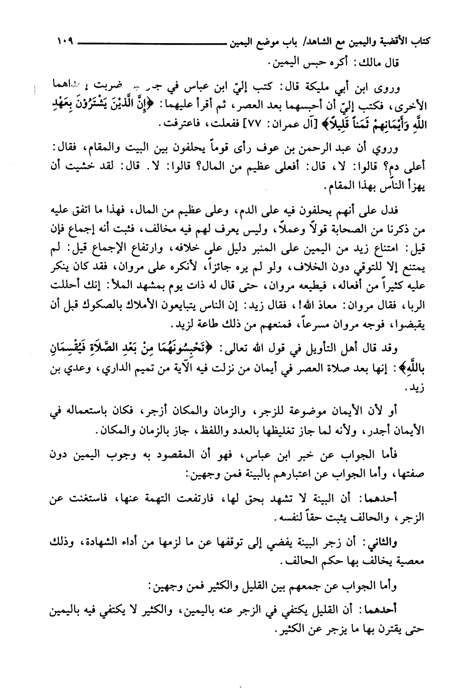 فَدَلَّ عَلَى أَنَّهُمْ يَحْلِفُونَ فِيهِ عَلَى الدَّمِ، وَعَلَى عَظِيمٍ مِنَ الْمَالِ، فَهَذَا مَا اتَّفَقَ عَلَيْهِ مَنْ ذَكَرْنَا مِنَ الصَّحَابَةِ قَوْلًا وَعَمَلًا، وَلَيْسَ يُعْرَفُ لَهُمْ فِيهِ مُخَالِفٌ، فَثَبَتَ أَنَّهُ إِجْمَاعٌ فَإِنْ قِيلَ: امْتِنَاعُ زَيْدٍ مِنَ الْيَمِينِ عَلَى الْمِنْبَرِ دَلِيلٌ عَلَى خِلَافِهِ، وَارْتِفَاعِ الْإِجْمَاعِ قِيلَ: لَمْ يَمْتَنِعْ إِلَّا لِلتَّوَقِّي دُونَ الْخِلَافِ، وَلَوْ لَمْ يَرَهُ جَائِزًا، لَأَنْكَرَهُ عَلَى مَرْوَانَ، فَقَدْ كَانَ يُنْكِرُ عَلَيْهِ كَثِيرًا مِنْ أَفْعَالِهِ، فَيُطِيعُهُ مَرْوَانُ، حَتَّى قَالَ لَهُ ذَاتَ يَوْمٍ بِمَشْهَدِ الْمَلَأِ: إِنَّكَ أَحْلَلْتَ الرِّبَا، فَقَالَ مَرْوَانُ: مَعَاذَ اللَّهِ! ، فَقَالَ زَيْدٌ: إِنَّ النَّاسَ يَتَبَايَعُونَ الْأَمْلَاكَ بِالصُّكُوكِ قَبْلَ أَنْ يَقْبِضُوا، فَوَجَّهَ مَرْوَانُ مُسْرِعًا، فَمَنَعَهُمْ مِنْ ذَلِكَ طَاعَةً لِزَيْدٍ.