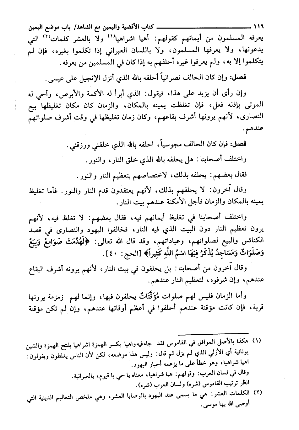 وَاخْتَلَفَ أَصْحَابُنَا فِي تَغْلِيظِ أَيْمَانِهِمْ فِيهِ، فَقَالَ بَعْضُهُمْ: لَا تُغَلَّظُ فِيهِ، لِأَنَّهُمْ يَرَوْنَ تَعْظِيمَ النَّارِ دُونَ الْبَيْتِ الَّذِي فِيهِ النَّارُ، فَخَالَفُوا الْيَهُودَ وَالنَّصَارَى فِي قَصْدِ الْكَنَائِسِ وَالْبِيَعِ لِصَلَوَاتِهِمْ، وَعِبَادَاتِهِمْ، وَقَدْ قَالَ اللَّهُ تَعَالَى: {لَهُدِّمَتْ صَوَامِعُ وَبِيَعٌ وَصَلَوَاتٌ وَمَسَاجِدُ يُذْكَرُ فِيهَا اسْمُ اللَّهِ كَثِيرًا} [الحج: 40] .