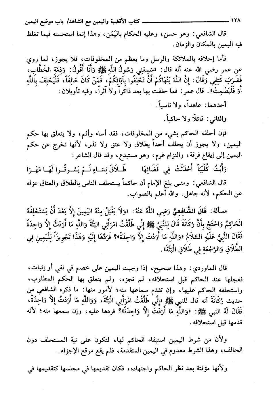 قَالَ الْمَاوَرْدِيُّ: وَهَذَا صَحِيحٌ، إِذَا وَجَبَتِ الْيَمِينُ على خصم في نفي أو إثبات، فعجلها عِنْدَ الْحَاكِمِ قَبْلَ اسْتِحْلَافِهِ، لَمْ تُجْزِهِ، وَلَمْ يَتَعَلَّقْ بِهَا الْحُكْمُ الْمَطْلُوبُ، وَاسْتَحْلَفَهُ الْحَاكِمُ عَلَيْهَا، وَإِنْ تَقَدَّمَ سَمَاعُهَا مِنْهُ؛ لِأُمُورٍ مِنْهَا: مَا ذَكَرَهُ الشَّافِعِيُّ مِنْ حَدِيثِ رُكَانَةَ أَنَّهُ قَالَ لِلنَّبِيِّ - صَلَّى اللَّهُ عَلَيْهِ وَسَلَّم َ - " إِنِّي طَلَّقْتُ امْرَأَتِي الْبَتَّةَ، وَوَاللَّهِ مَا أَرَدْتُ إِلَّا وَاحِدَةً، فَقَالَ لَهُ النَّبِيُّ - صَلَّى اللَّهُ عَلَيْهِ وَسَلَّم َ -: " وَاللَّهِ مَا أَرَدْتَ إِلَّا وَاحِدَةً "؟ فَرَدَّهَا عَلَيْهِ، وَإِنْ سَمِعَهَا مِنْهُ؛ لِأَنَّهُ قَدَّمَهَا قَبْلَ اسْتِحْلَافِهِ.